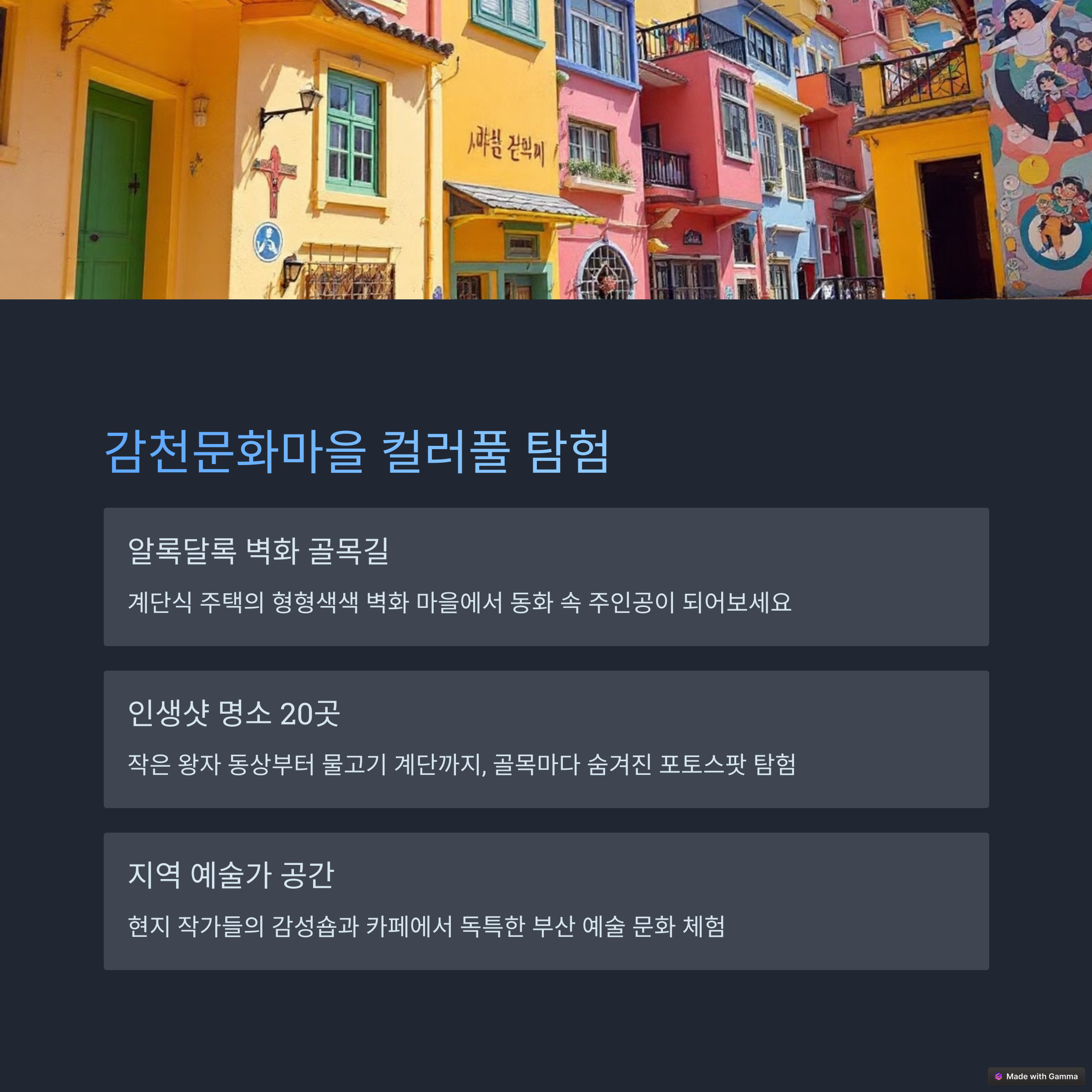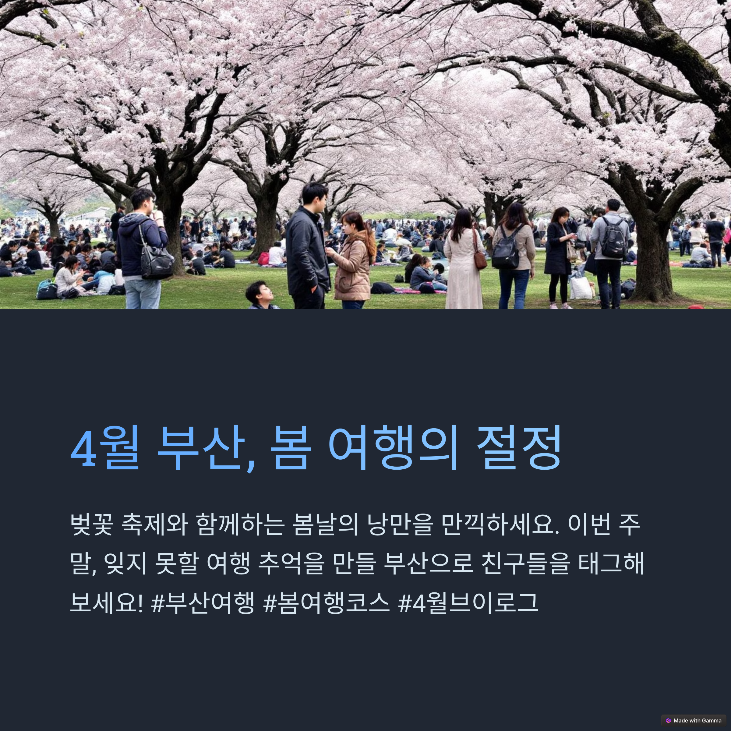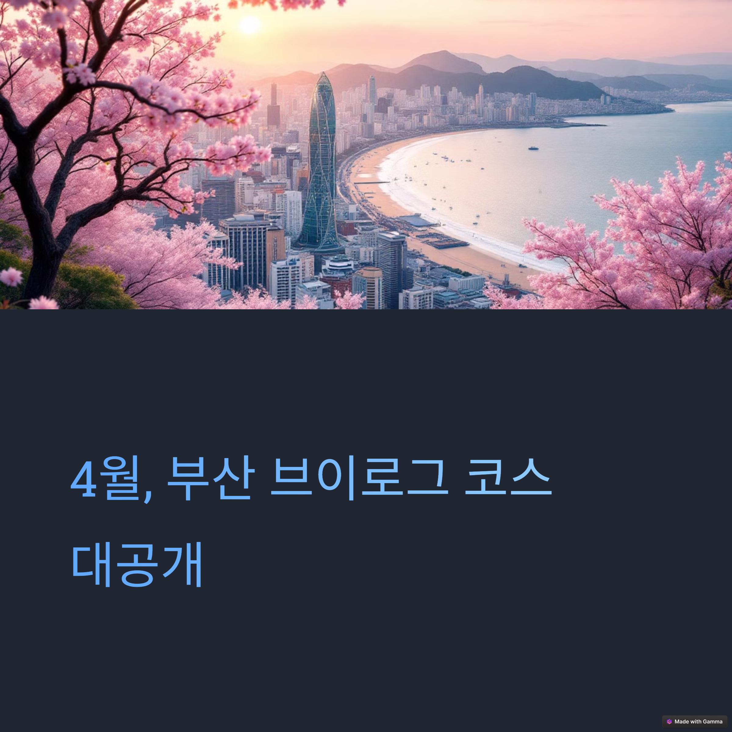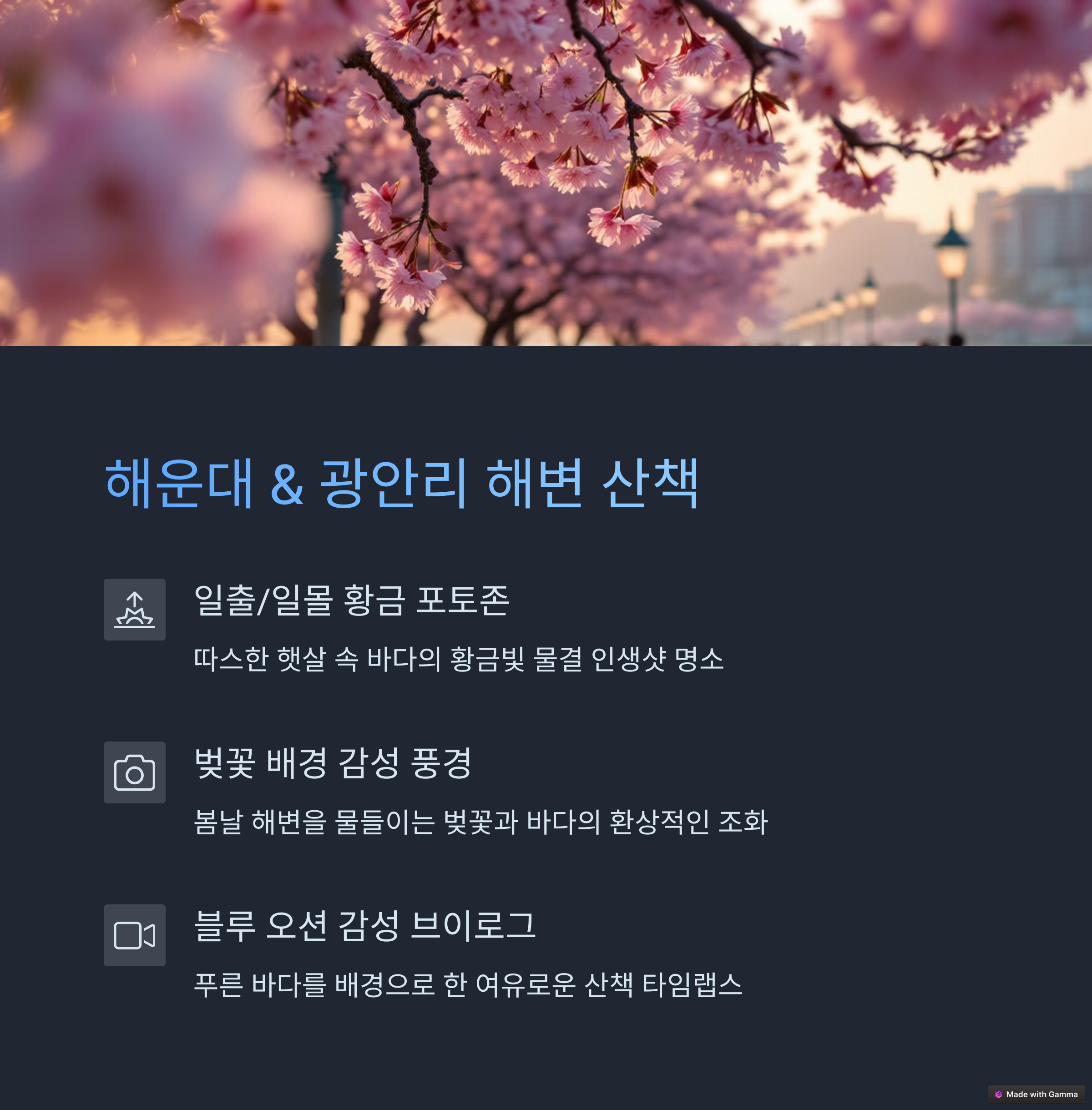 | 감천문화마을, 해운대, 송도 케이블카는 봄 브이로그의 핵심 장소입니다. | 4월에는 온 도시가 벚꽃으로 물들며 사진과 영상 모두 만족스러워요. | 해산물 먹방, 해변 산책, 전망대 컷으로 영상의 완성도를 높일 수 있어요. |