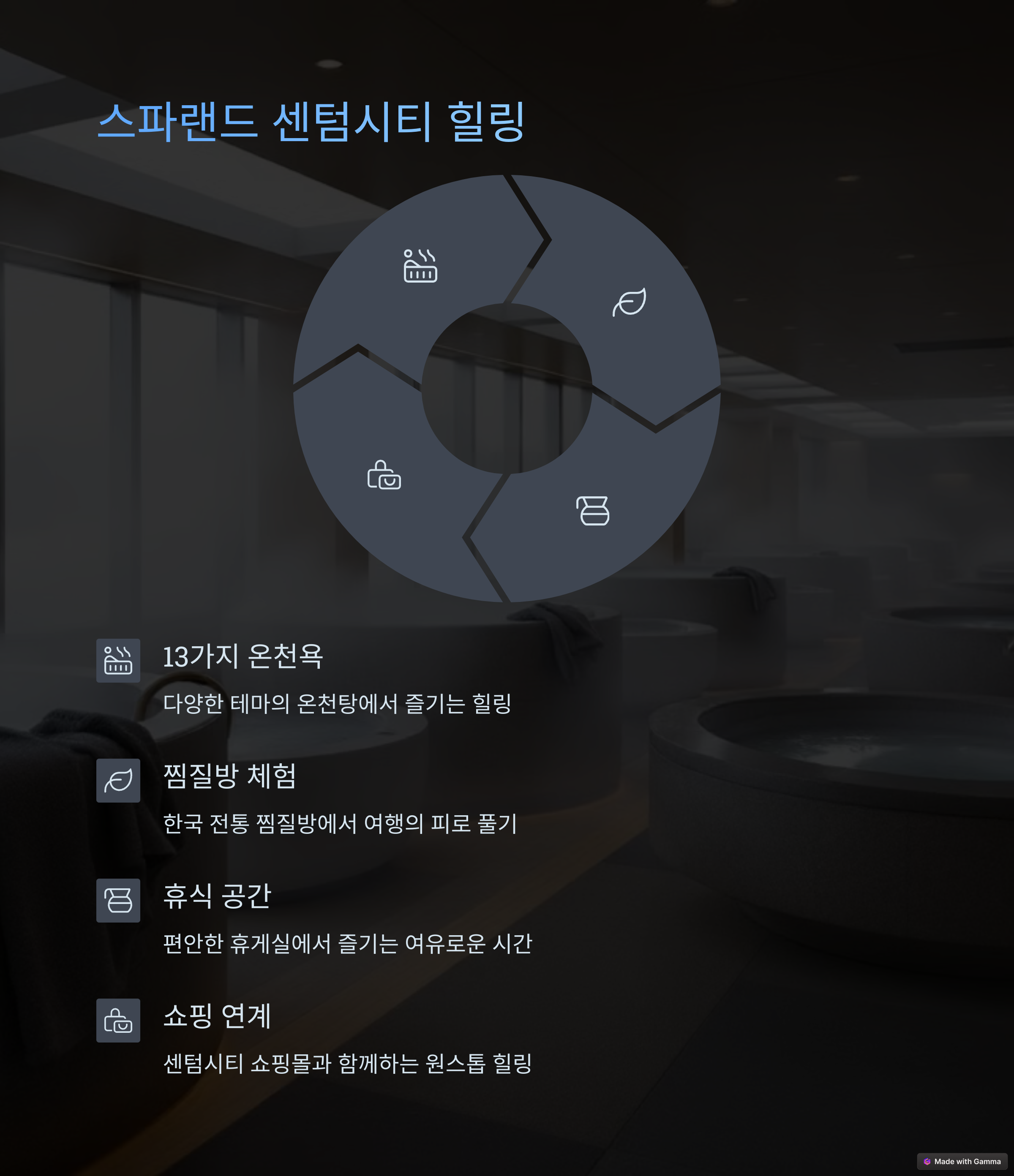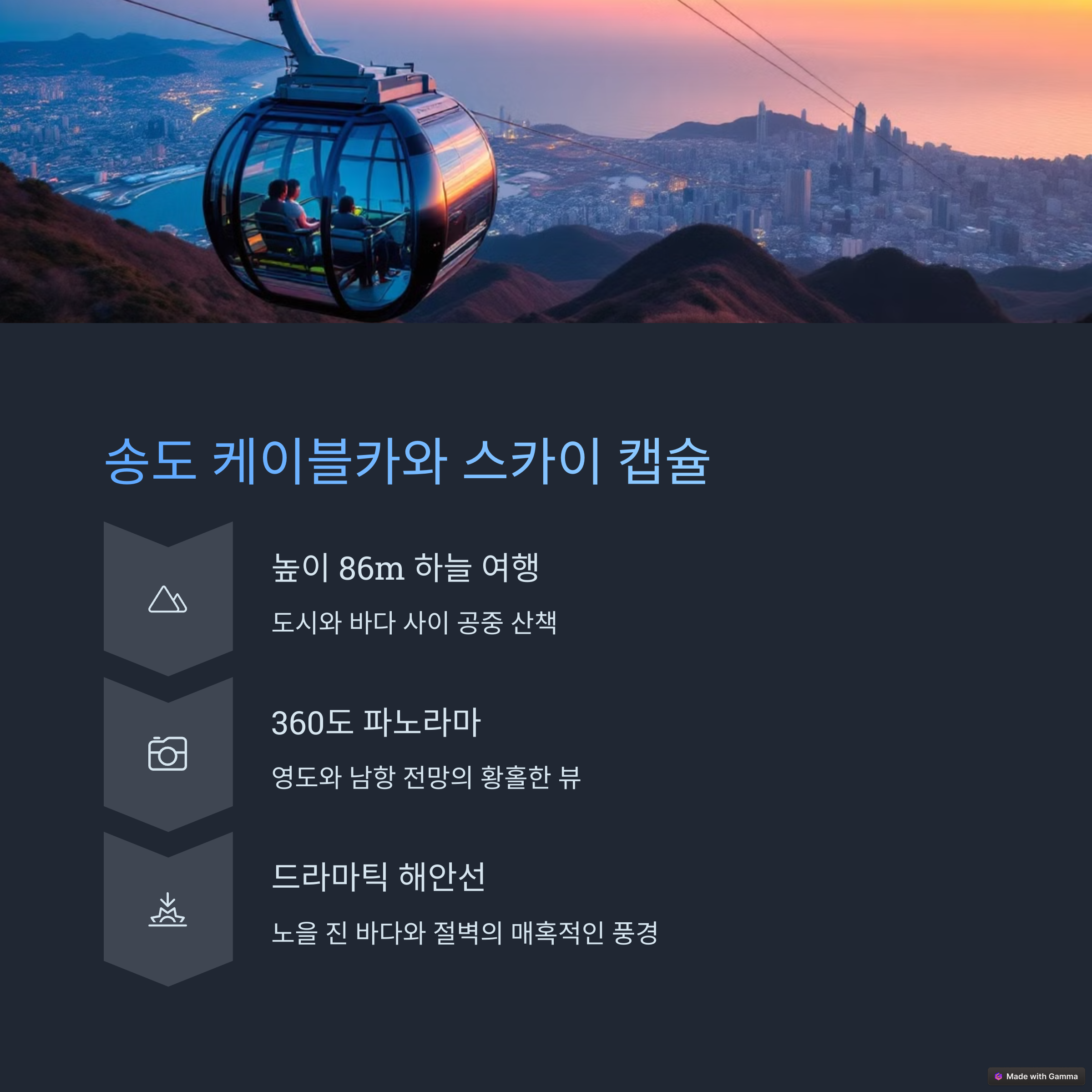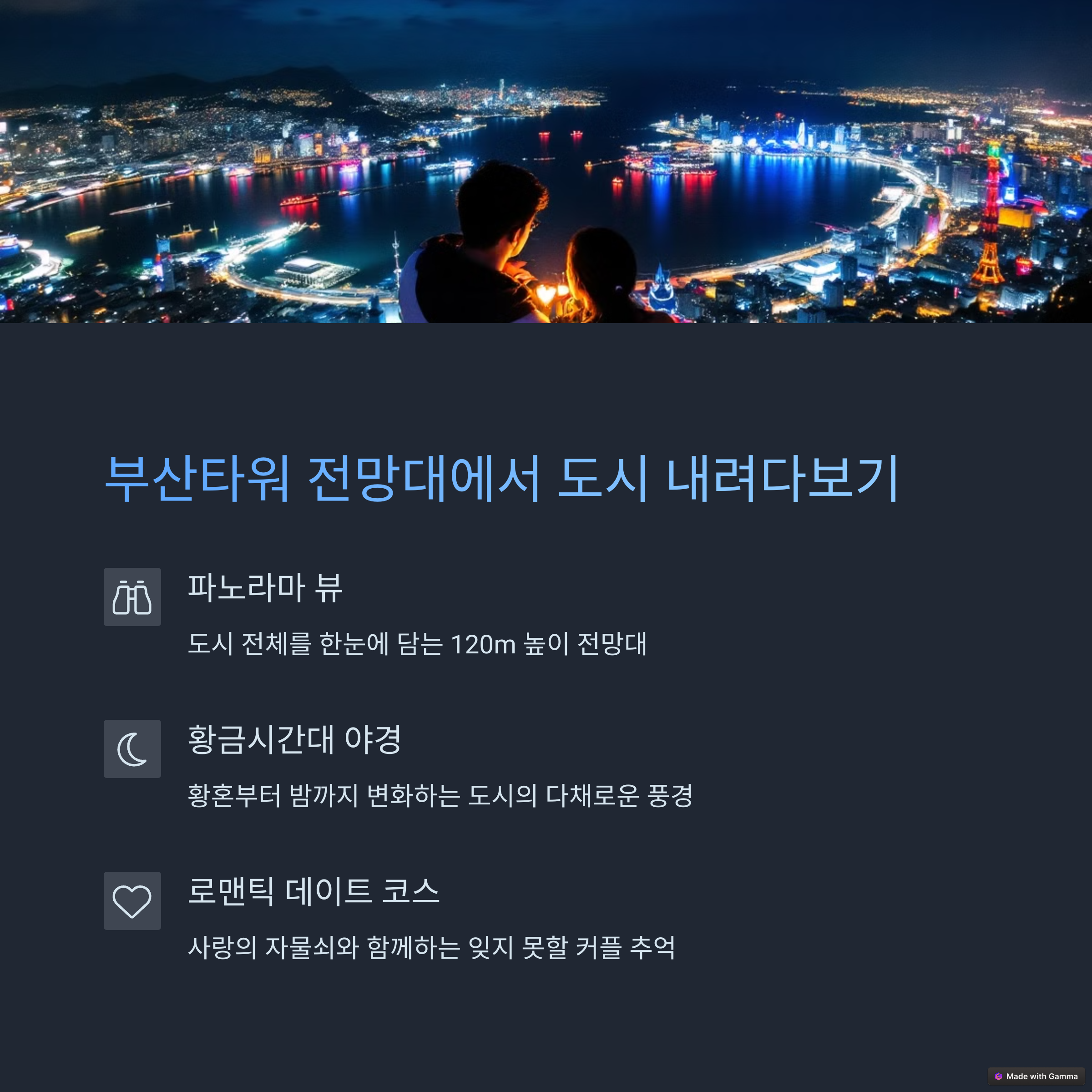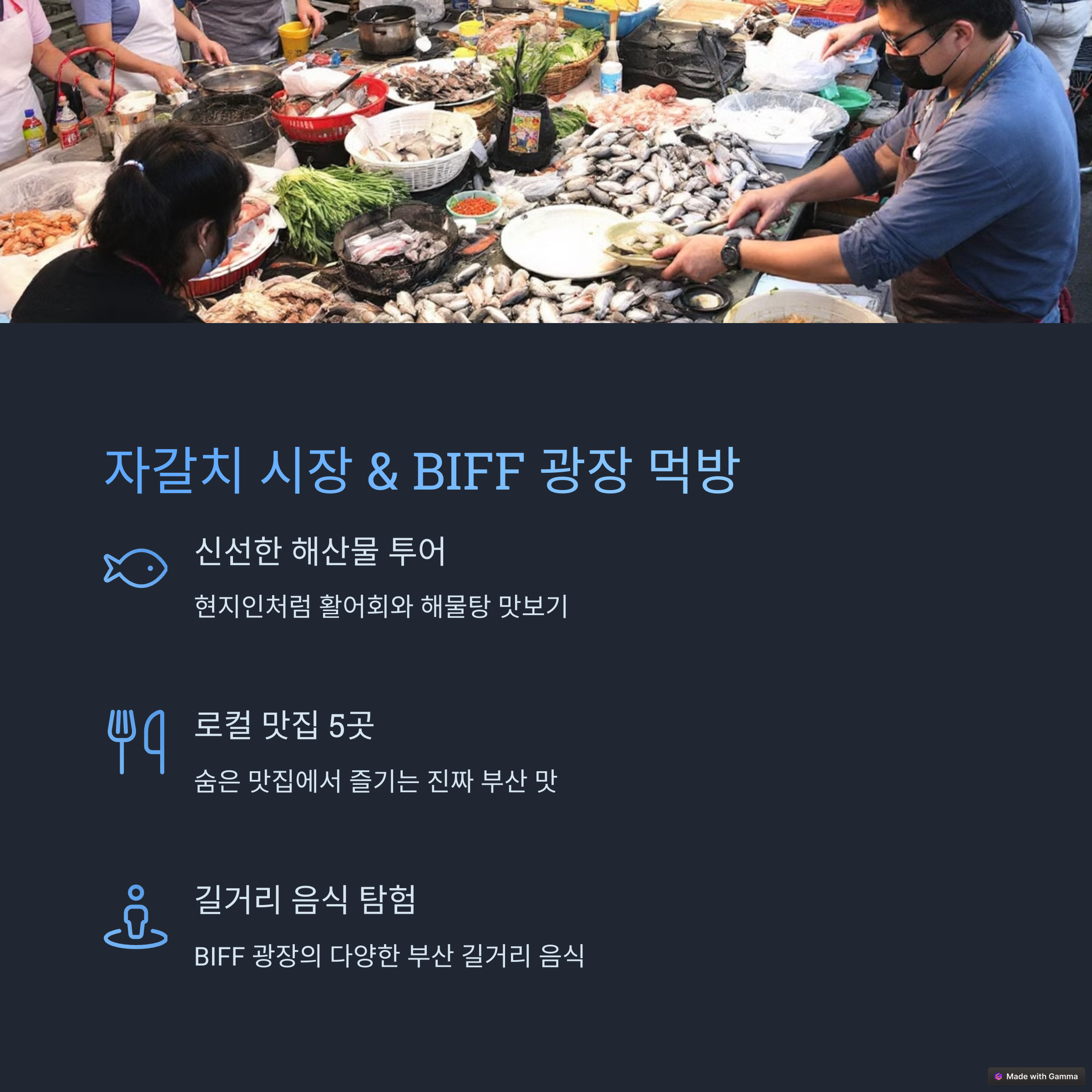 자갈치 시장과 BIFF 광장은 부산의 맛과 활기를 영상으로 담을 수 있는 핵심 스팟입니다. 길거리 음식과 해산물 요리는 브이로그에서 시청자의 이목을 끌 수 있는 중요한 콘텐츠입니다. 직접 맛을 보며 생생한 리액션을 담는 것도 좋습니다. 이후에는 스파랜드 센텀시티에서 촬영을 마무리하면 힐링 콘텐츠로 자연스럽게 연결됩니다. 마지막 코스로 부산타워 전망대나 송도 스카이캡슐을 이용해 고도에서 바라본 부산 전경을 넣으면 브이로그 전체의 완성도를 높일 수 있습니다.