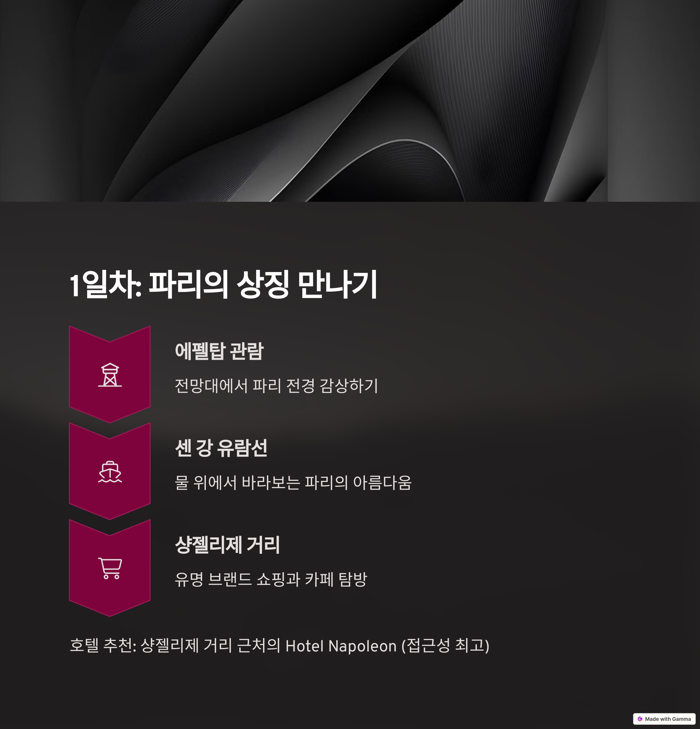 첫째 날은 에펠탑부터 샹젤리제 거리까지, 파리의 상징을 느끼는 여정이 될 것입니다.