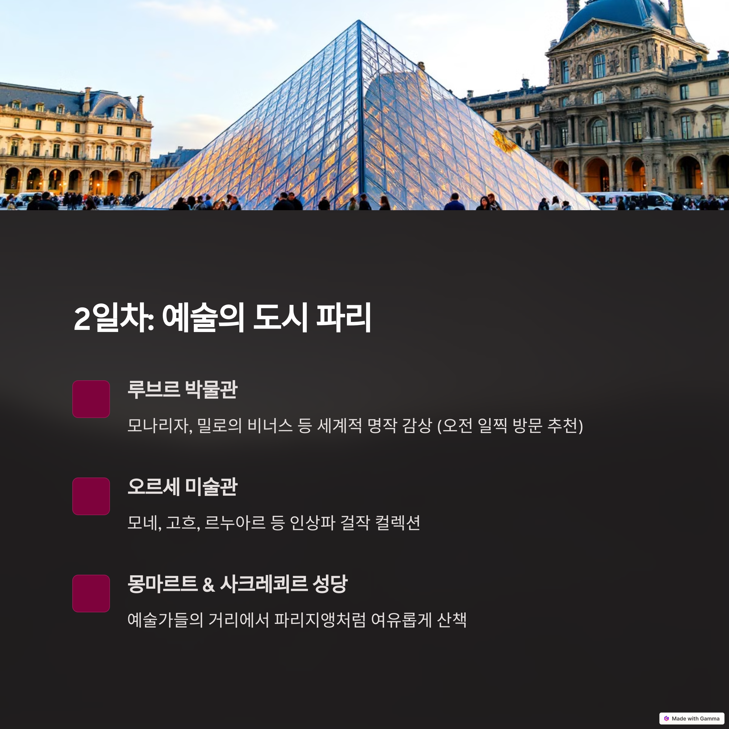 둘째 날에는 루브르 박물관과 오르세 미술관에서 예술과 문화를 즐기며 깊은 감동을 받을 수 있습니다.