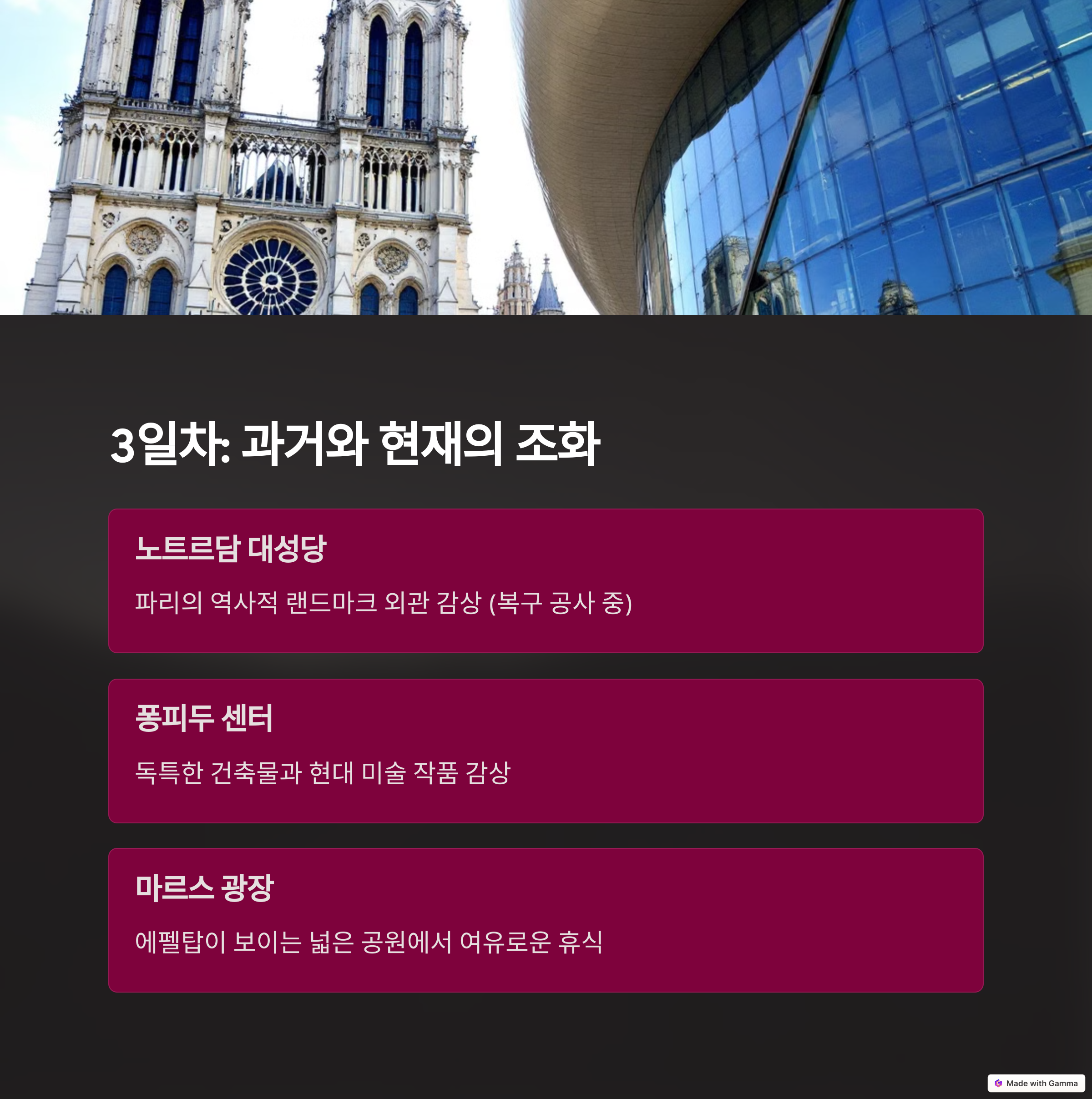 | 3일차 | 퐁피두 센터 | 노트르담 대성당 | 마르스 광장 분수 |