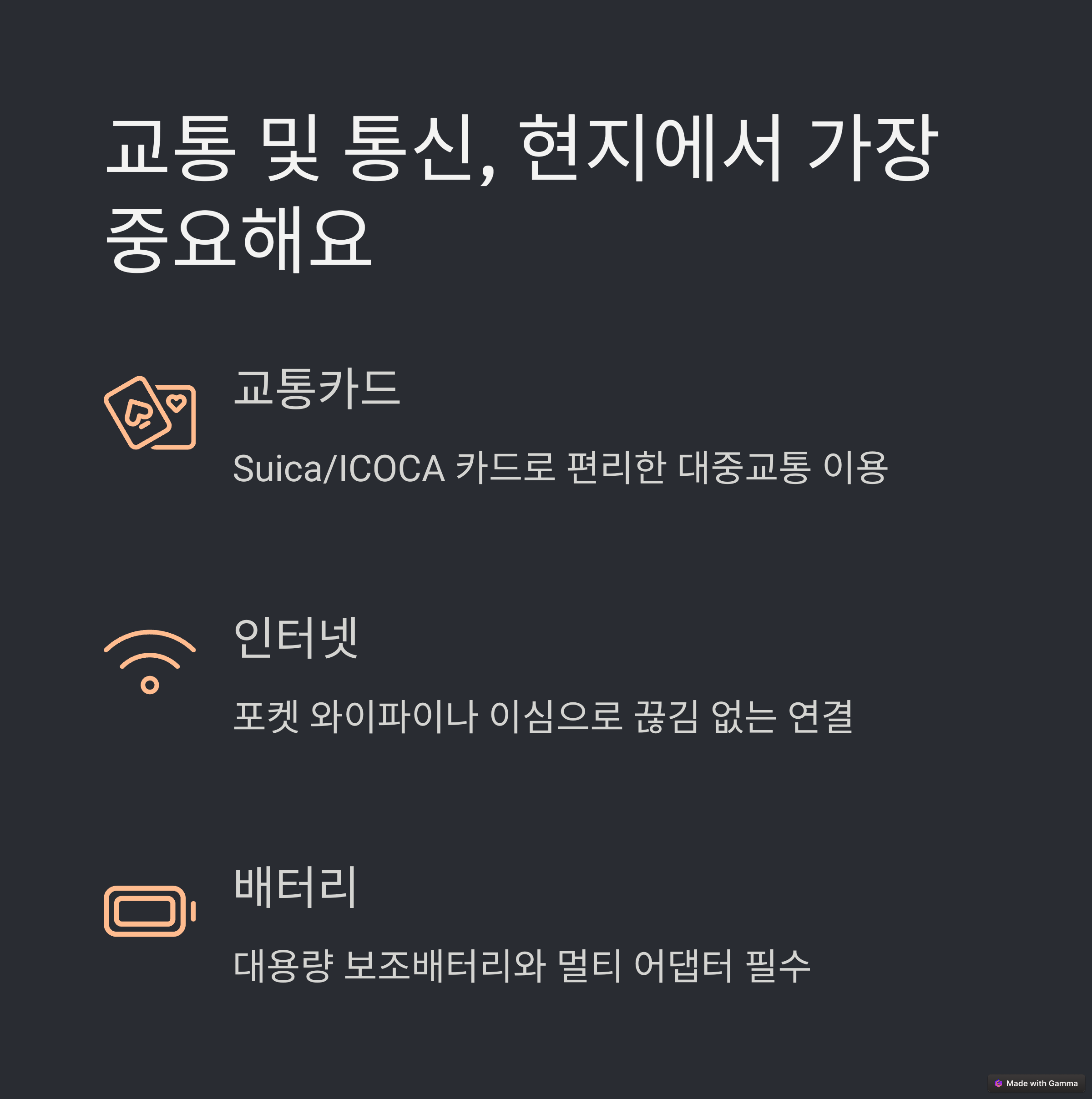 IT 기기 역시 빼놓을 수 없습니다. 포켓 와이파이 또는 이심 유심을 통해 인터넷 환경을 준비하세요.