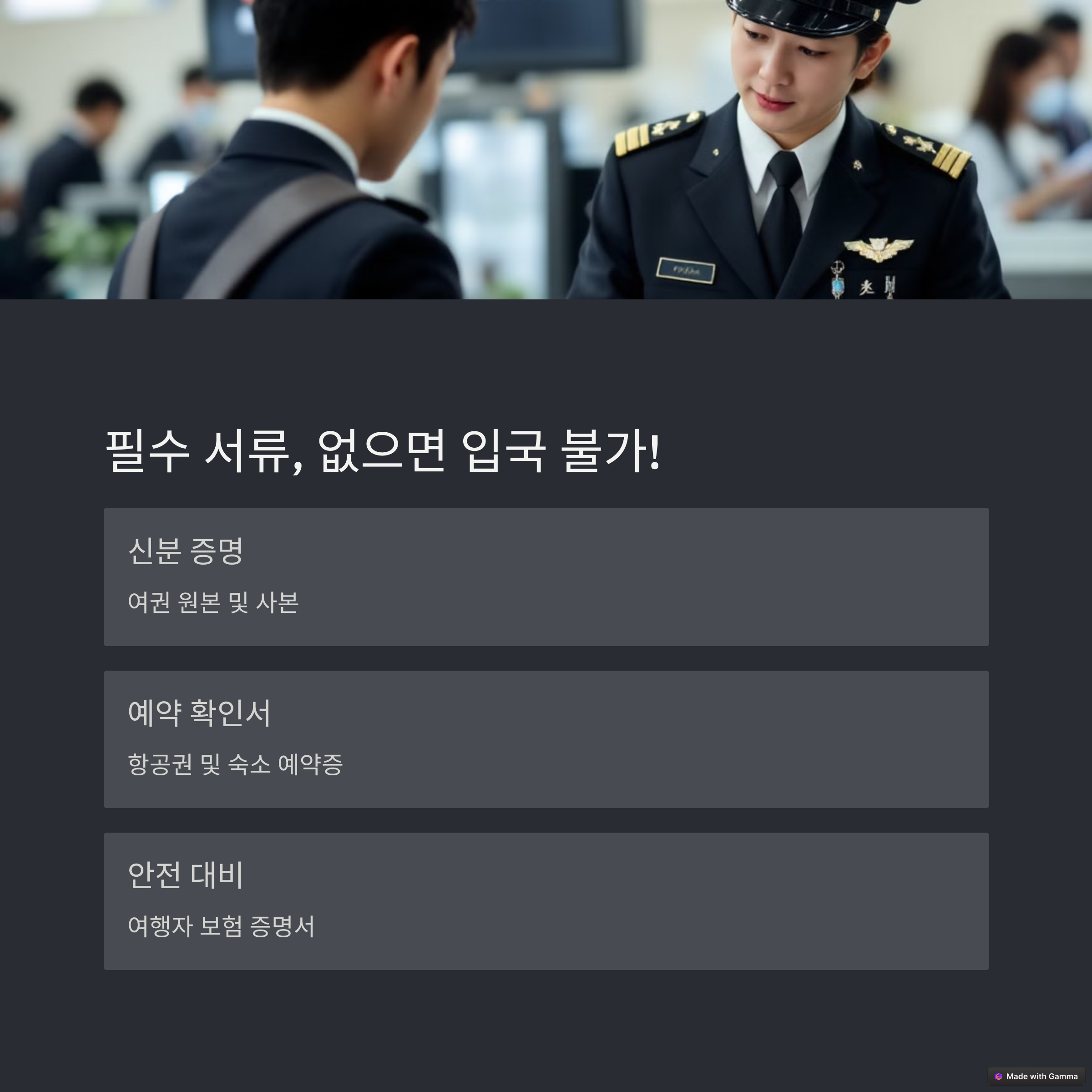 | 필수 서류 | 여권, 항공권, 보험 등 |