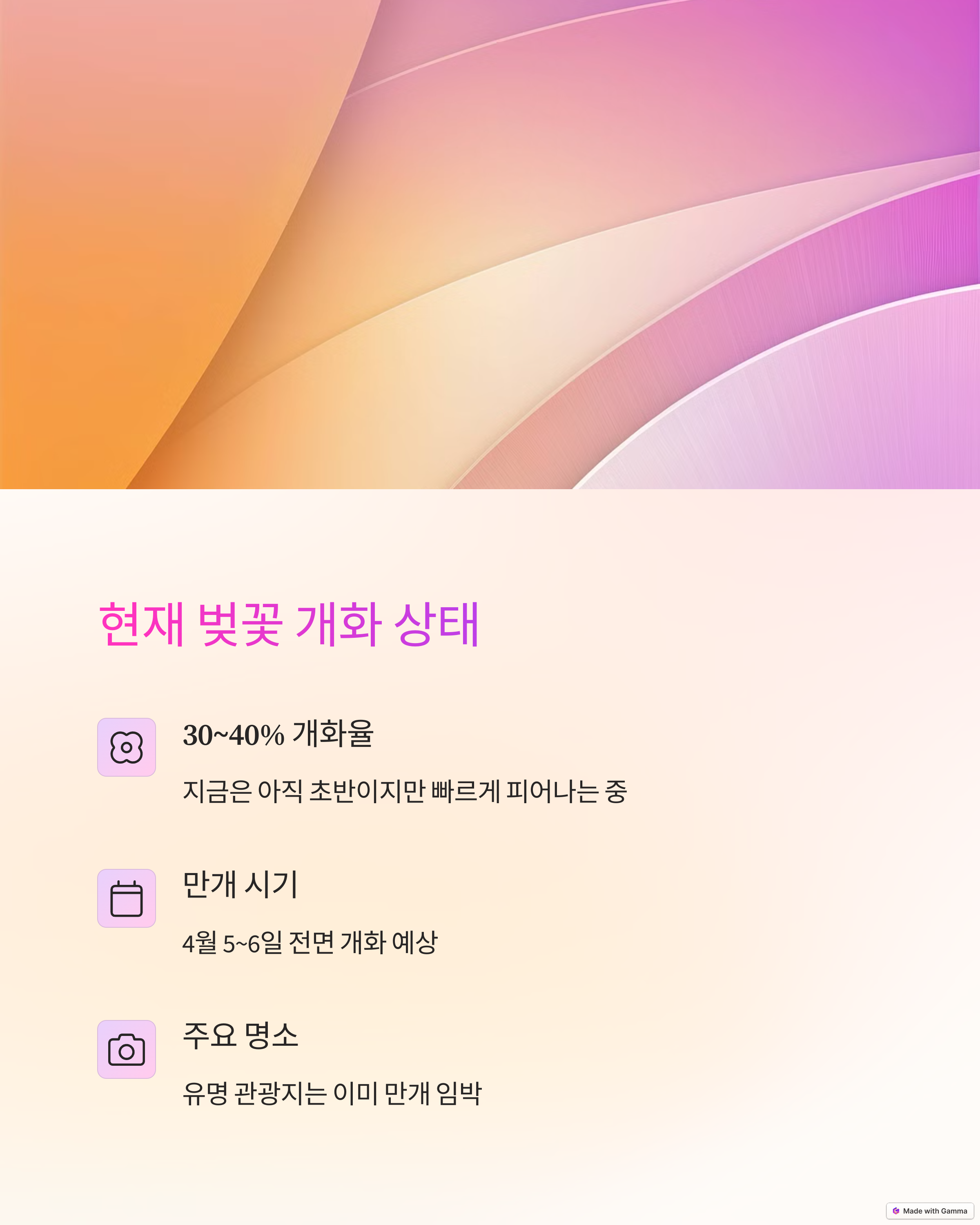 | 개화 시기 | 이번 주말부터 다음 주 초반 만개 예정입니다. |