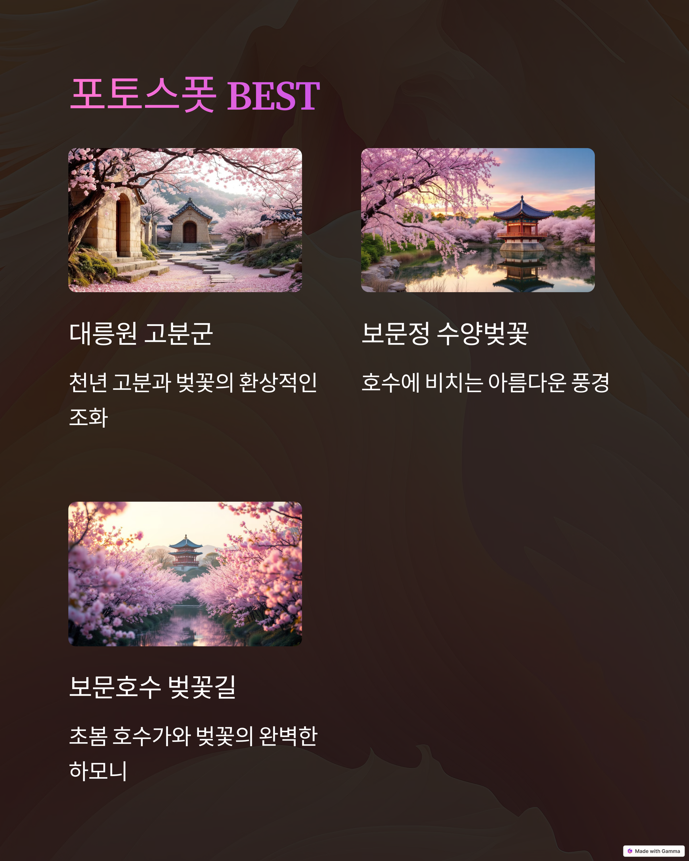 특히 대릉원 돌담길과 김유신묘 뒷길은 이미 절정에 가까운 벚꽃 풍경을 보여주고 있으며, 이 지역들은 사진 촬영이나 산책 코스로도 인기가 많습니다. 더불어 보문단지와 불국사 역시 이번 주말을 기점으로 본격적인 개화가 시작되어 가족 단위 여행객과 연인들의 방문이 예상됩니다. 벚꽃 아래에서 여유롭게 산책하며 역사와 자연을 동시에 느낄 수 있는 경주의 매력은 언제 방문해도 특별하지만, 지금은 더욱 각별한 시기입니다.