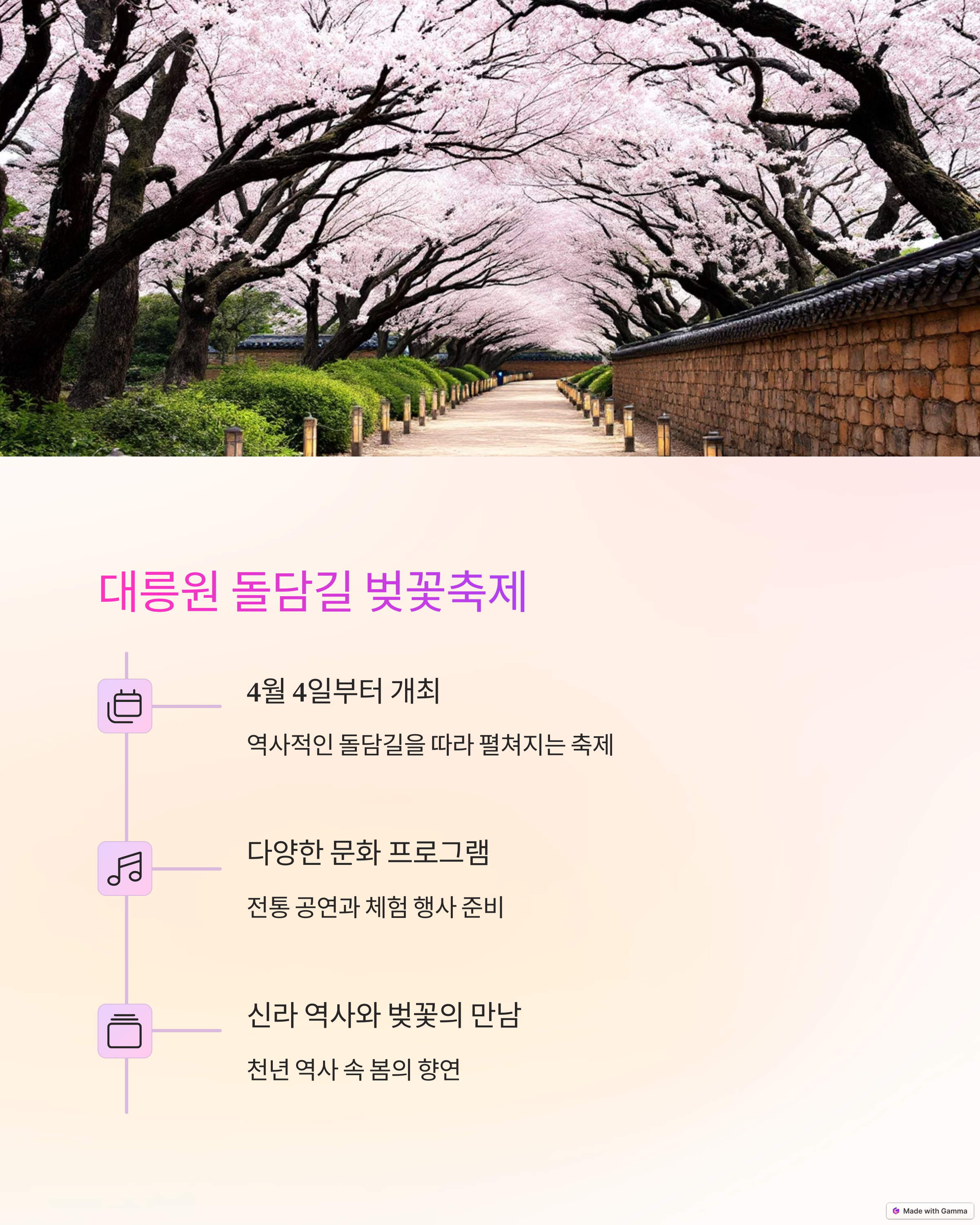 | 이번 주말~다음 주 초 만개 예상 | 보문단지와 불국사도 절정기에 진입 중 | 문화공연, 야경 조명, 체험 부스 운영 |