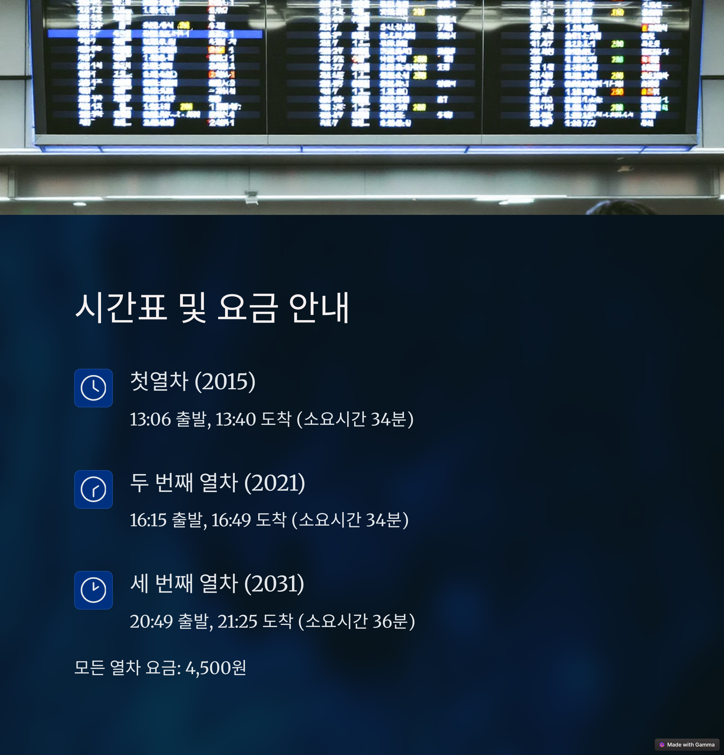 | 출발 시간 | 도착 시간 | 열차 번호 | 요금 |