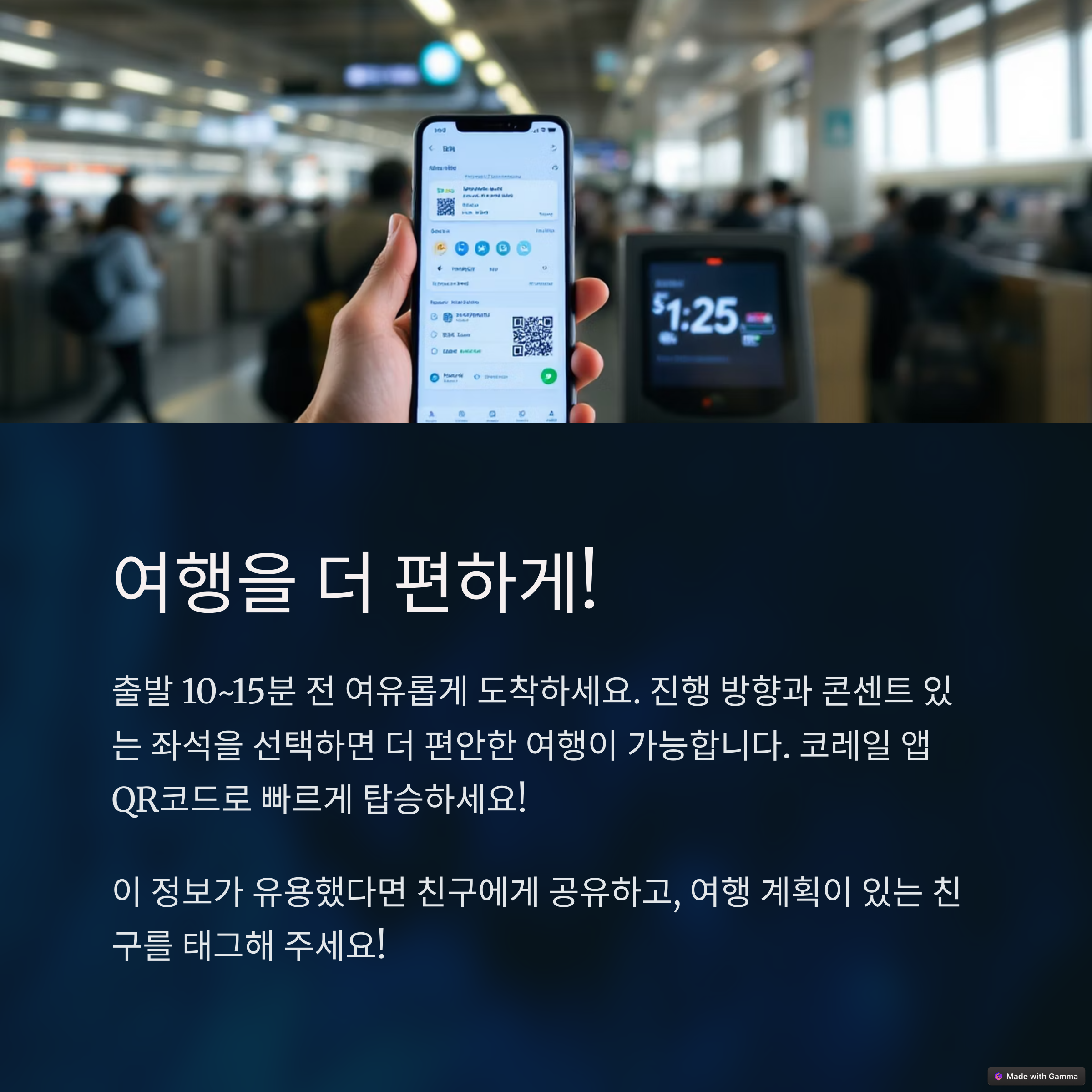 탑승 전 15분 여유를 두고 도착하면 티켓 확인과 승강장 이동이 더욱 원활하게 진행됩니다.