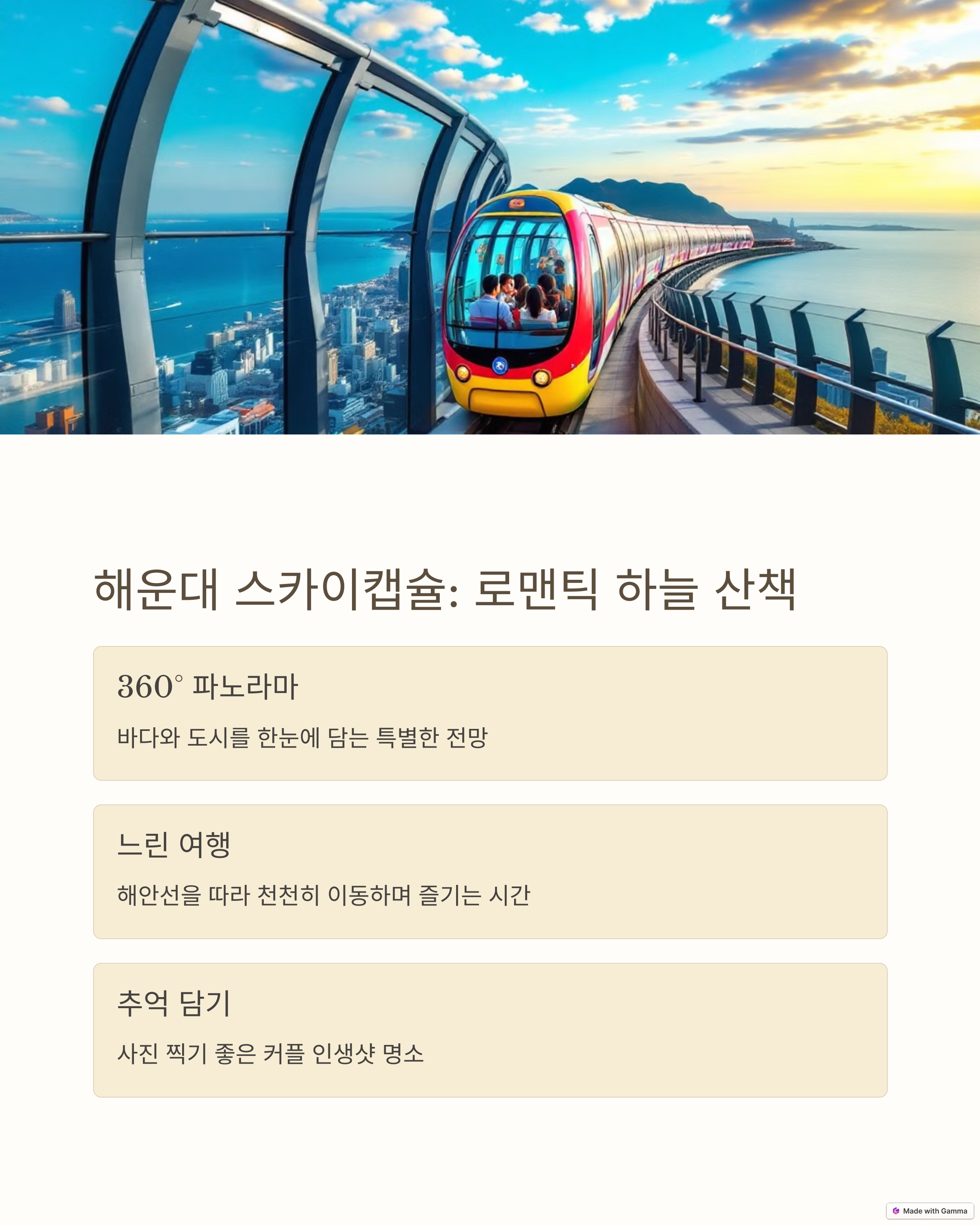 | 해운대 스카이 캡슐 | 바다를 따라 달리는 감성적인 열차 체험 코스입니다. |