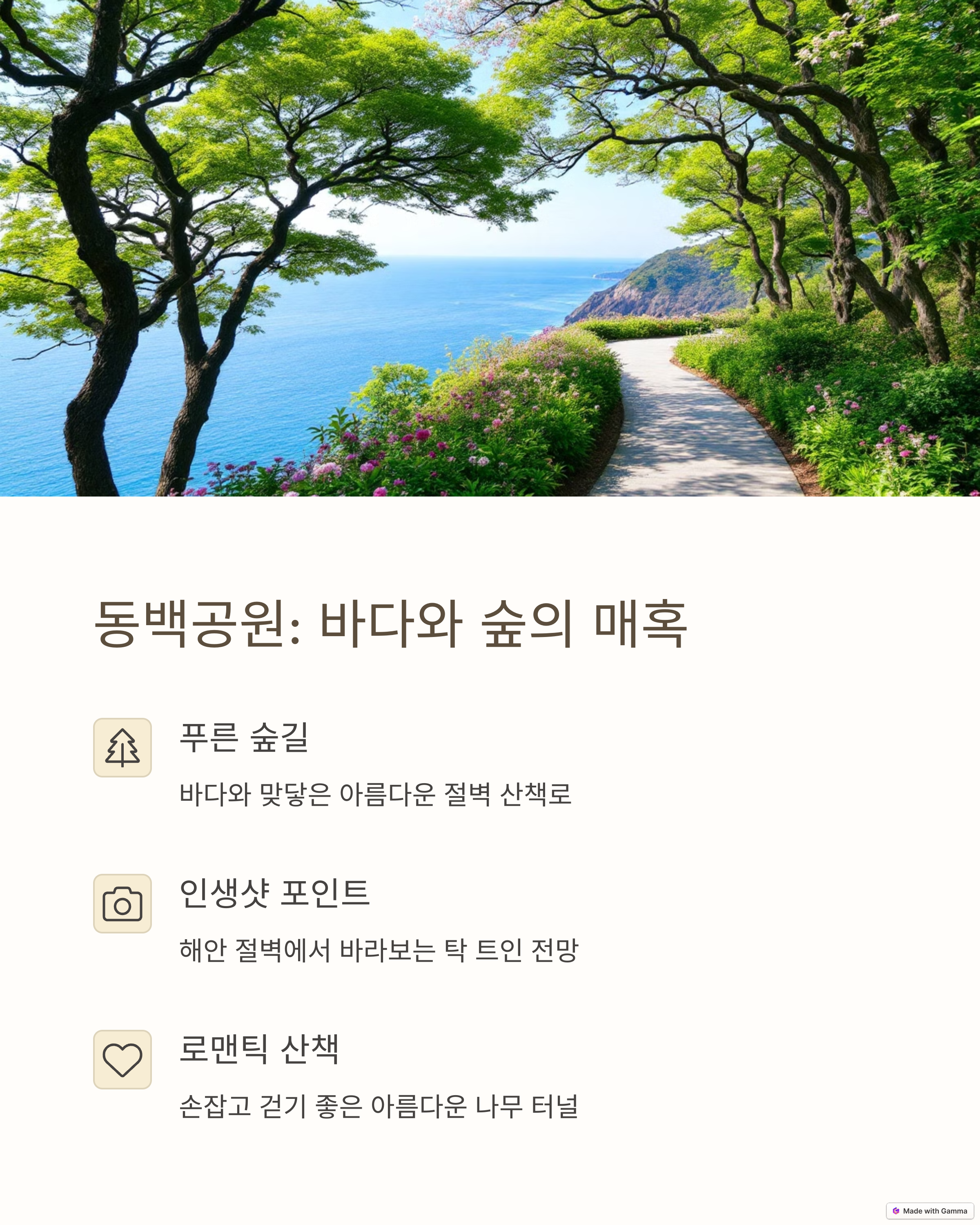 | 바다 따라 달리는 감성적인 열차 체험 | 숲과 바다가 어우러진 절벽 산책길 | 매주 토요일 밤 펼쳐지는 화려한 공연 |