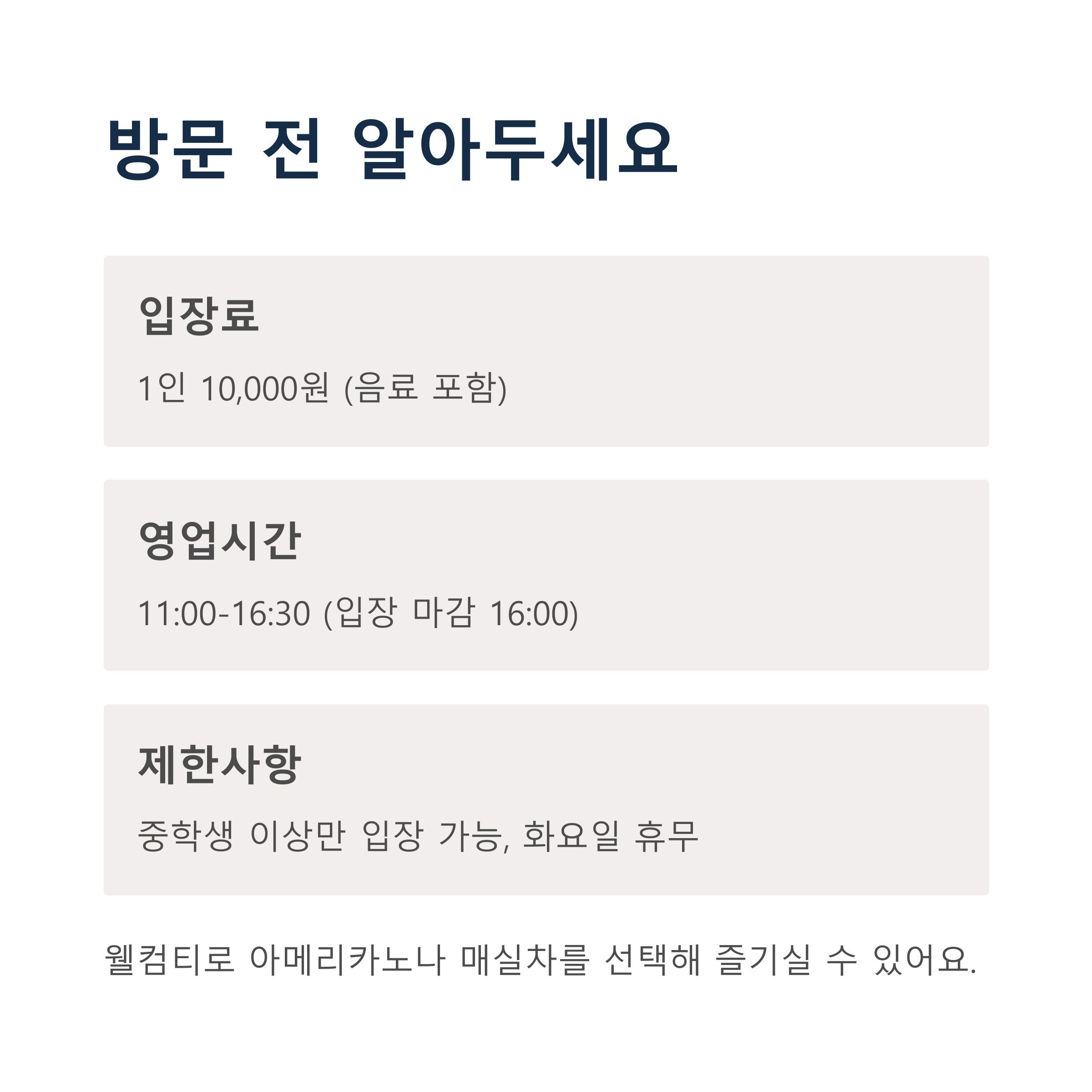 중학생 이상 입장이 가능한 유료 공간으로, 10,000원의 입장료에 웰컴 음료가 포함됩니다.