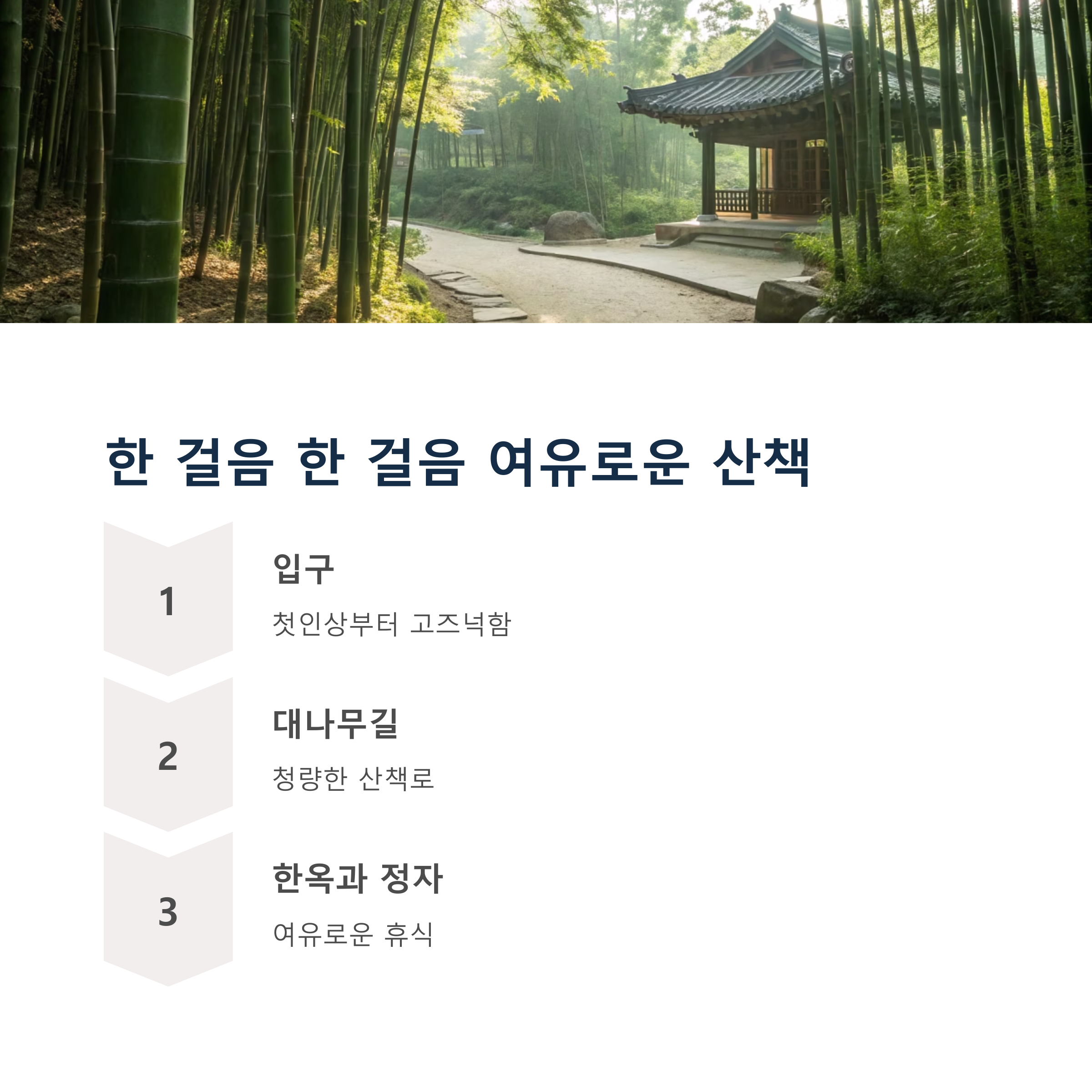| 대나무길 관람에는 약 15분에서 20분 정도 소요됩니다. 여유로운 걸음으로 걷는다면 더 풍성한 자연의 멋을 느끼실 수 있습니다. 대나무길의 청량감과 동굴처럼 이어진 길은 사진 촬영 장소로도 인기입니다. 특히 봄에는 신록과 벚꽃이 어우러져 더욱 아름다운 배경을 제공합니다. 시간을 절약하려면 한옥 내부를 관람하기 전에 대나무길을 순서대로 둘러보시길 추천드립니다. |