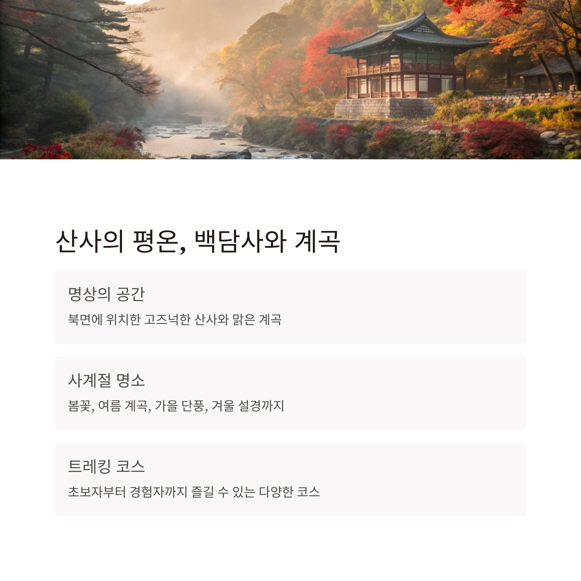 특히 백담사로 가는 길은 가을 단풍과 겨울 설경으로 유명합니다.