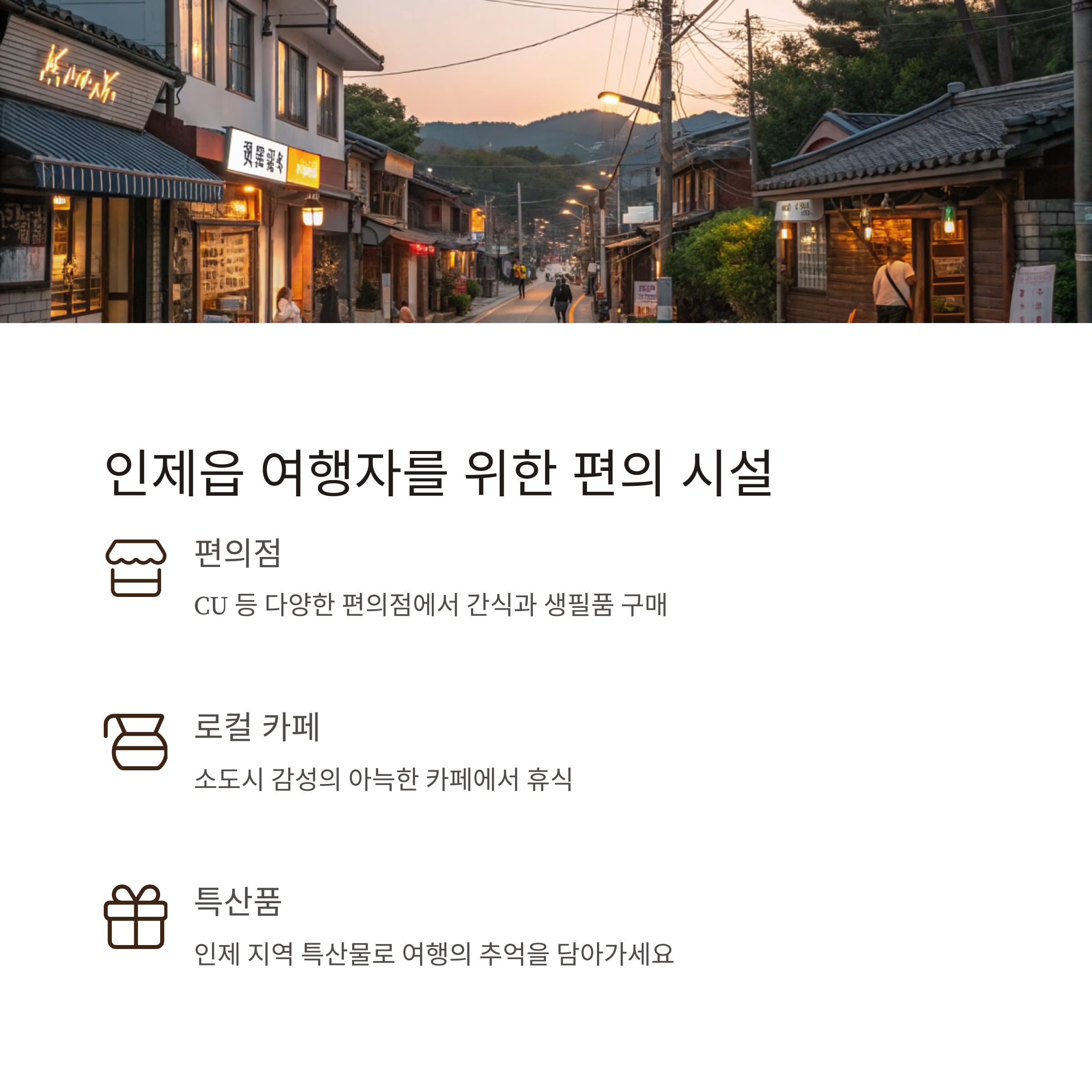 인제읍내에서는 도보로 이동 가능한 다양한 편의시설과 음식점이 있어 여행 중 필요한 것을 손쉽게 해결할 수 있습니다.