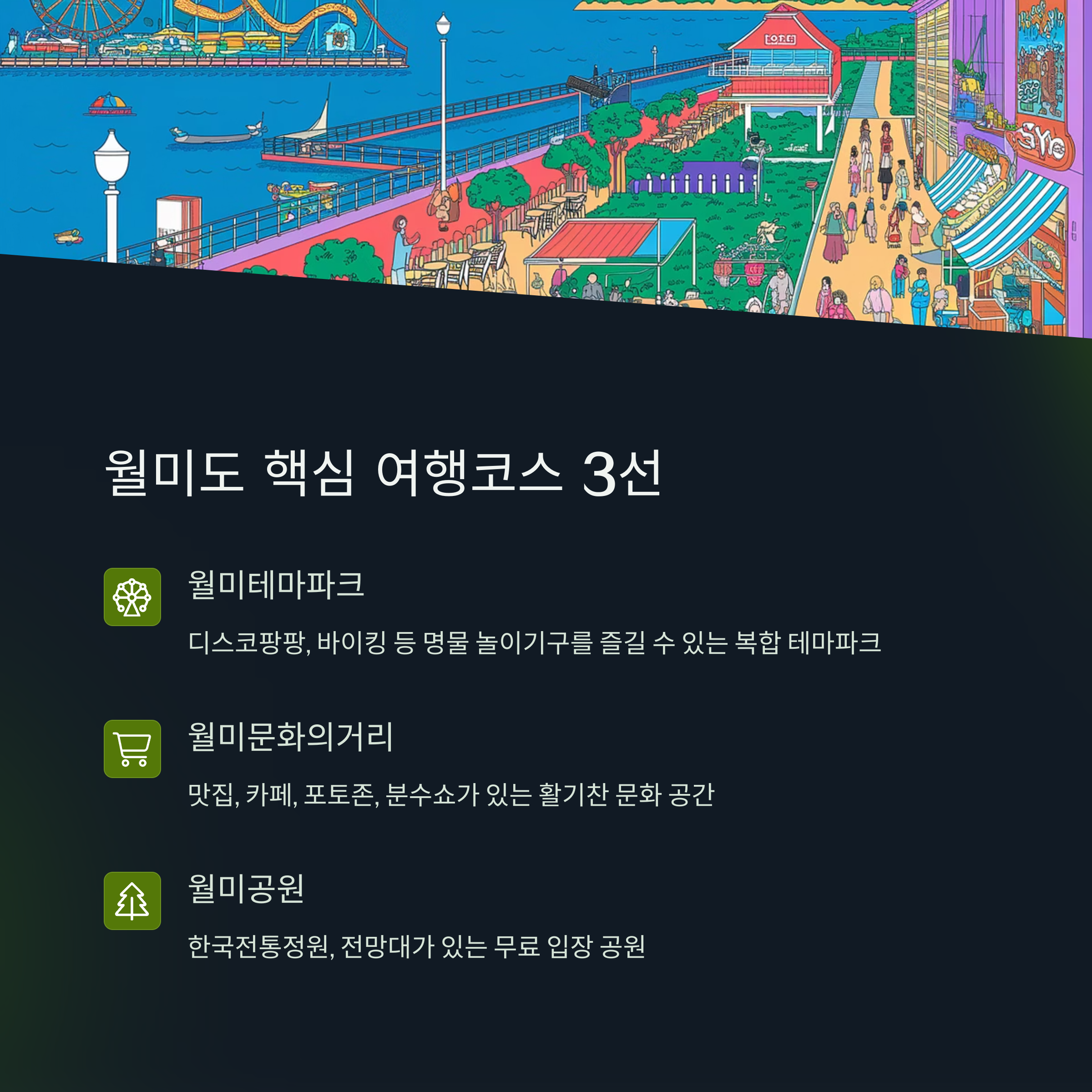 대표 명소는 월미테마파크, 월미문화의 거리 등 다양한 볼거리로 구성됩니다.