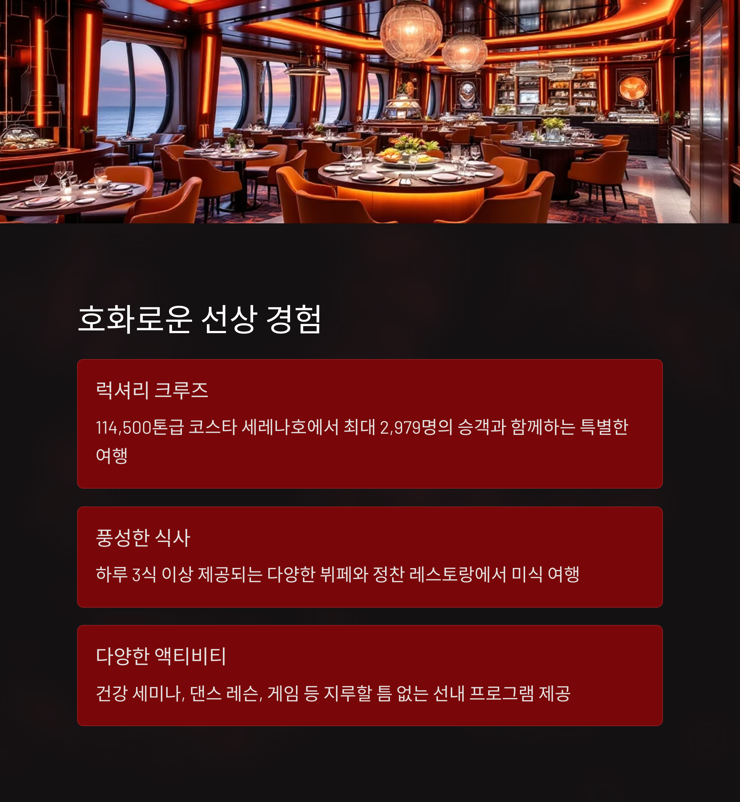 | 5월 8일, 5월 13일 등 선택 가능 | 코스타 세레나 (11만 톤급) | 부모님, 부부, 자녀 포함 가족 여행 |
