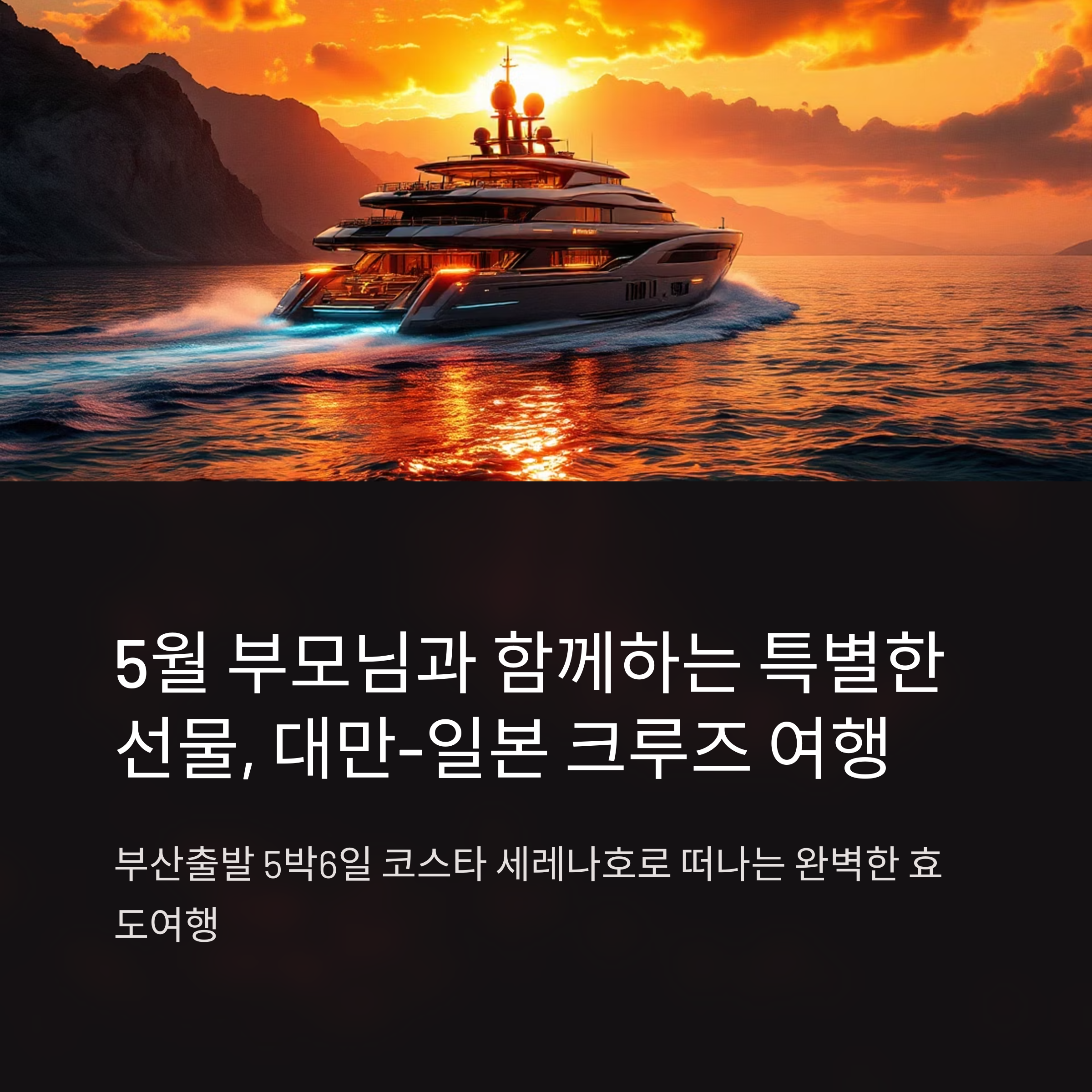 효도여행을 고민하고 계신다면, 바다 위에서 누리는 여유로운 시간과 다양한 나라의 문화를 함께 즐길 수 있는 크루즈 여행은 최고의 선택이 될 수 있습니다. 최근 많은 분들이 선택하고 있는 크루즈 패키지는 단순한 관광을 넘어서, 숙소, 식사, 공연, 휴식까지 모두 갖춘 올인원 여행으로 부모님들께 편안함과 감동을 동시에 선물할 수 있습니다. 특히, 대만과 일본을 한 번에 경험할 수 있는 코스타 세레나 크루즈 일정은 가성비와 만족도가 높아 더욱 추천됩니다.