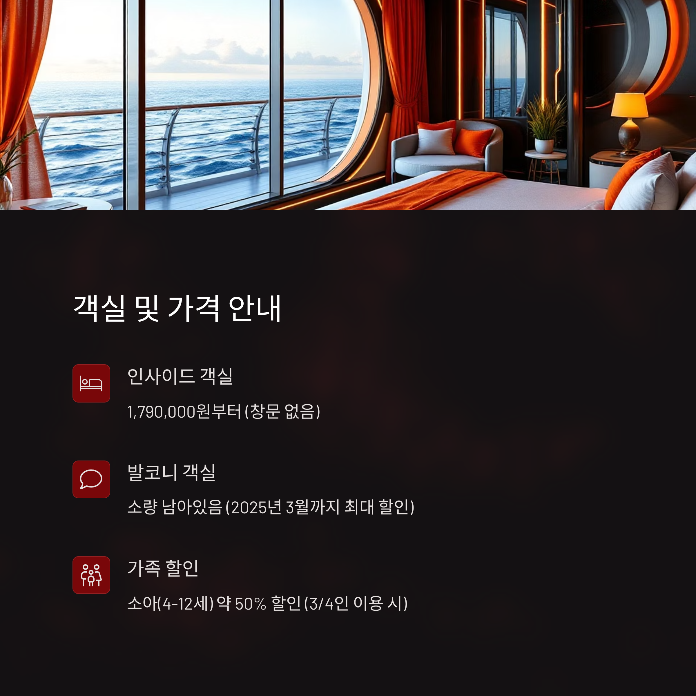 이번 크루즈 패키지의 가장 큰 장점은 모든 세대가 만족할 수 있는 여행이라는 점입니다. 부모님께는 편안한 휴식을, 자녀에게는 색다른 모험을, 부부에게는 로맨틱한 시간을 제공합니다. 숙소, 식사, 이동이 한 번에 해결되는 일정은 번거로움 없이 오직 가족과의 추억에 집중할 수 있게 도와줍니다. 올봄, 함께 떠나는 가족 여행으로 크루즈를 선택해보세요.
