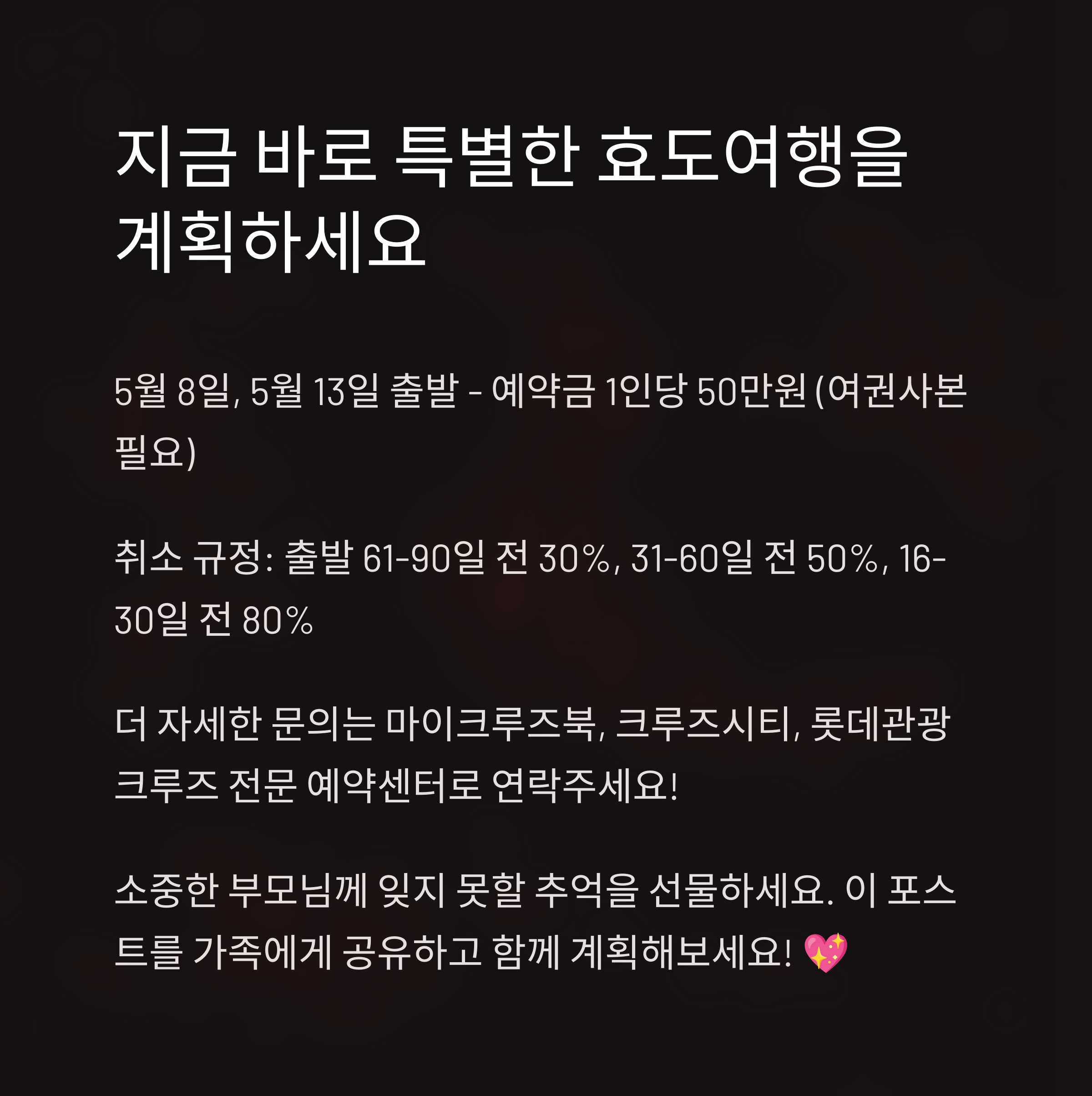 크루즈 여행은 단순한 관광을 넘어선, 삶의 쉼표가 되는 여정입니다. 바다 위에서 누리는 힐링, 각국의 문화를 만나는 설렘, 그리고 무엇보다 사랑하는 부모님과의 깊은 교감까지. 이번 봄에는 조금 더 특별한 여행으로 효도의 마음을 전해보는 건 어떨까요? 대만과 일본을 아우르는 5박 6일 크루즈는 그런 의미에서 최고의 선택이 될 수 있습니다. 예약 전 일정을 꼼꼼히 확인하시고, 즐거운 준비가 되시길 바랍니다.