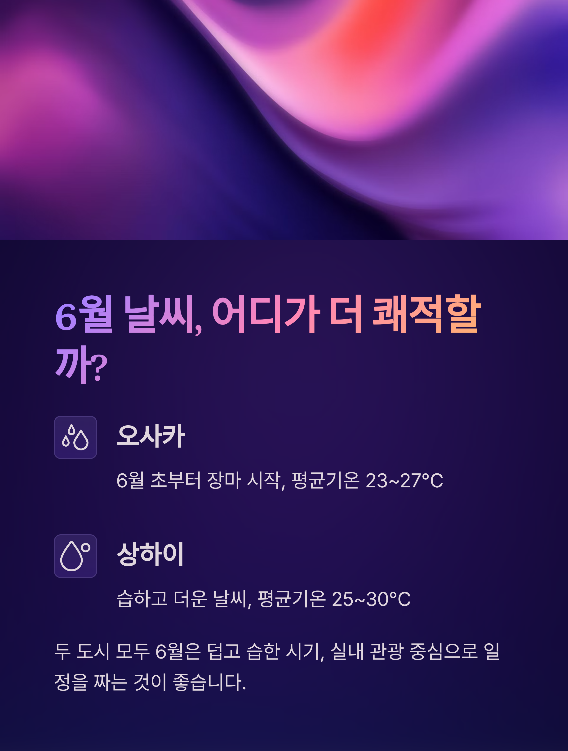 "두 도시 모두 6월은 덥고 습한 시기, 날씨보다는 실내 관광 중심으로 일정을 짜는 것이 좋습니다."