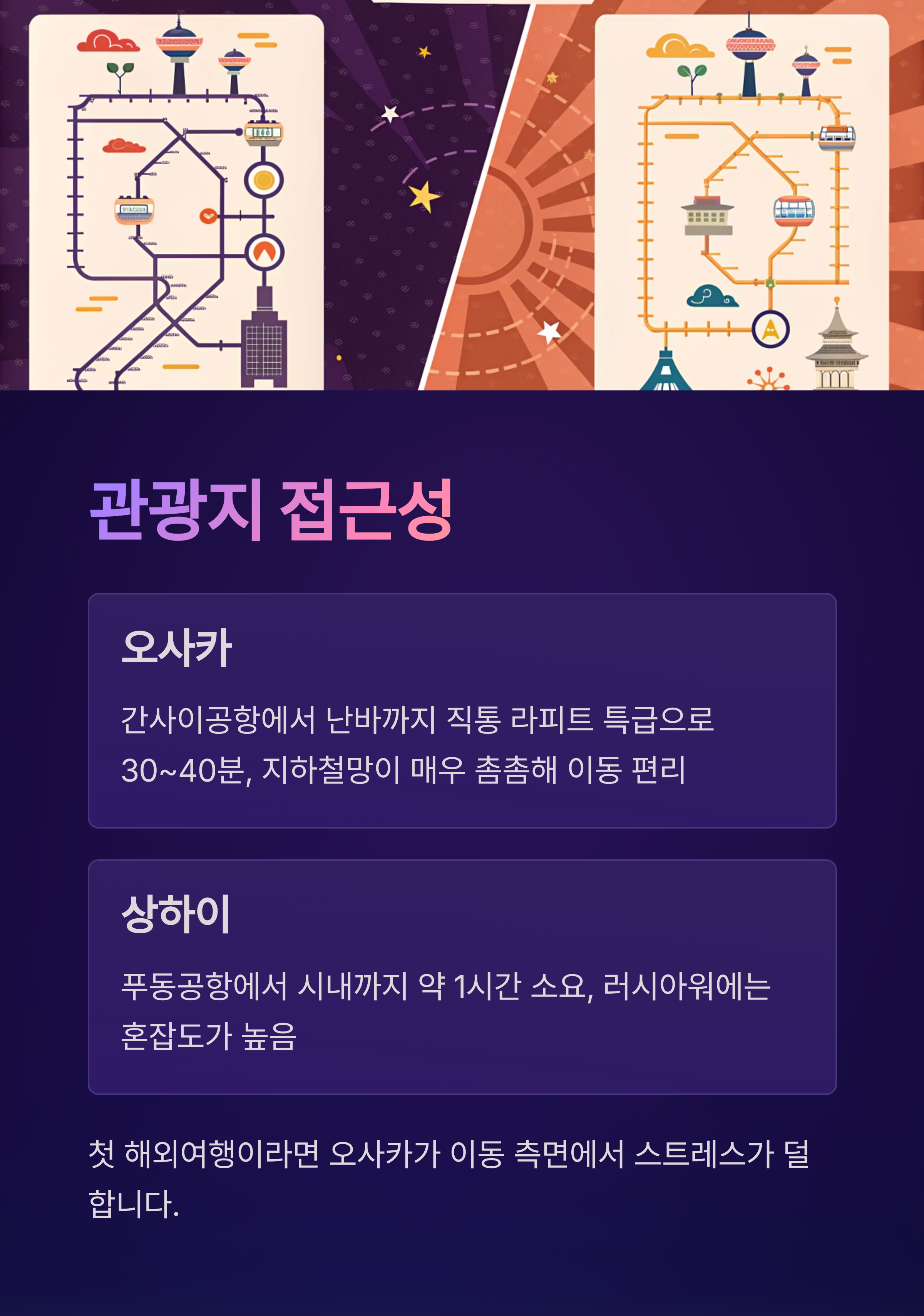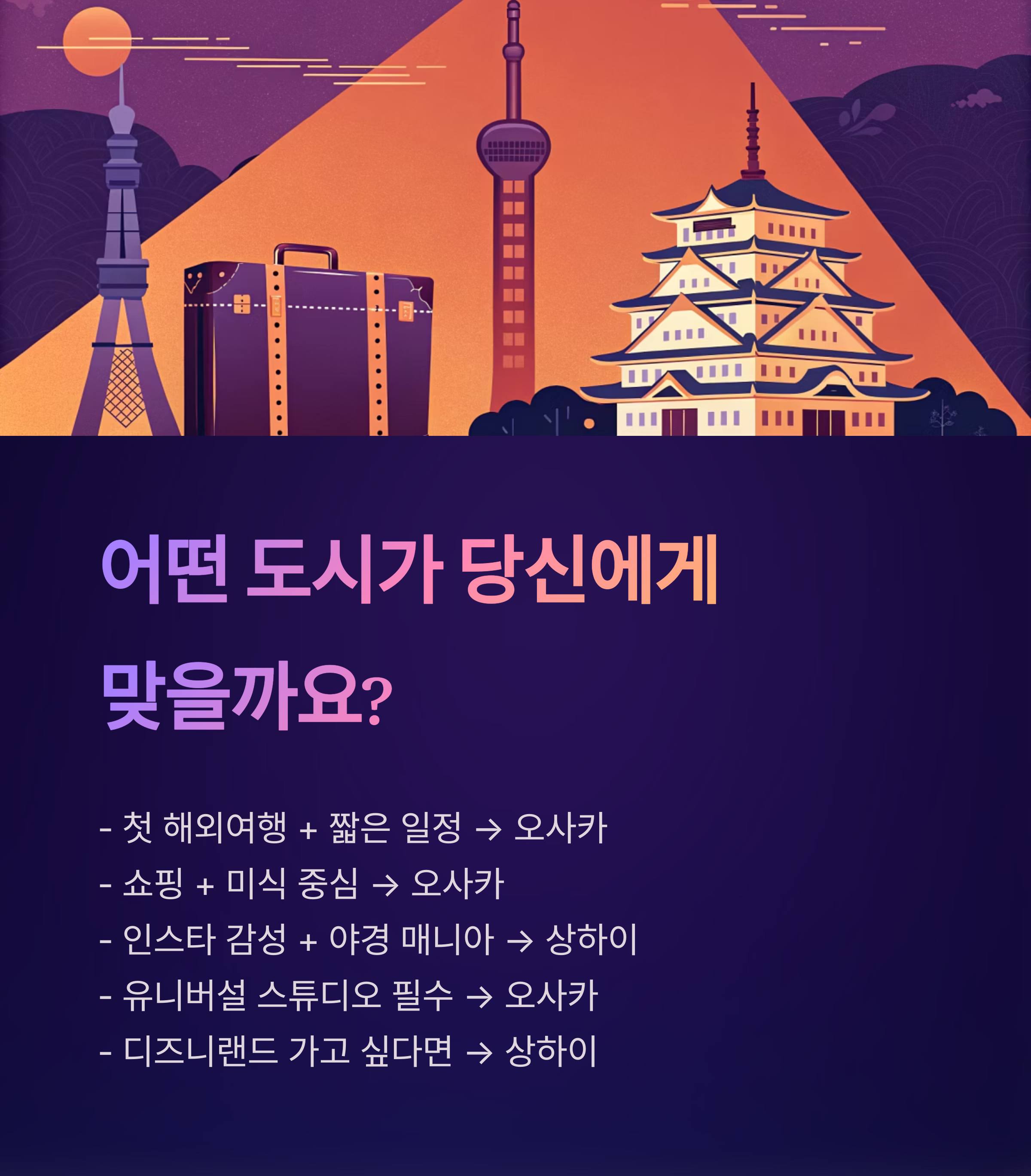 - 첫 해외여행 + 짧은 일정 → 오사카 추천