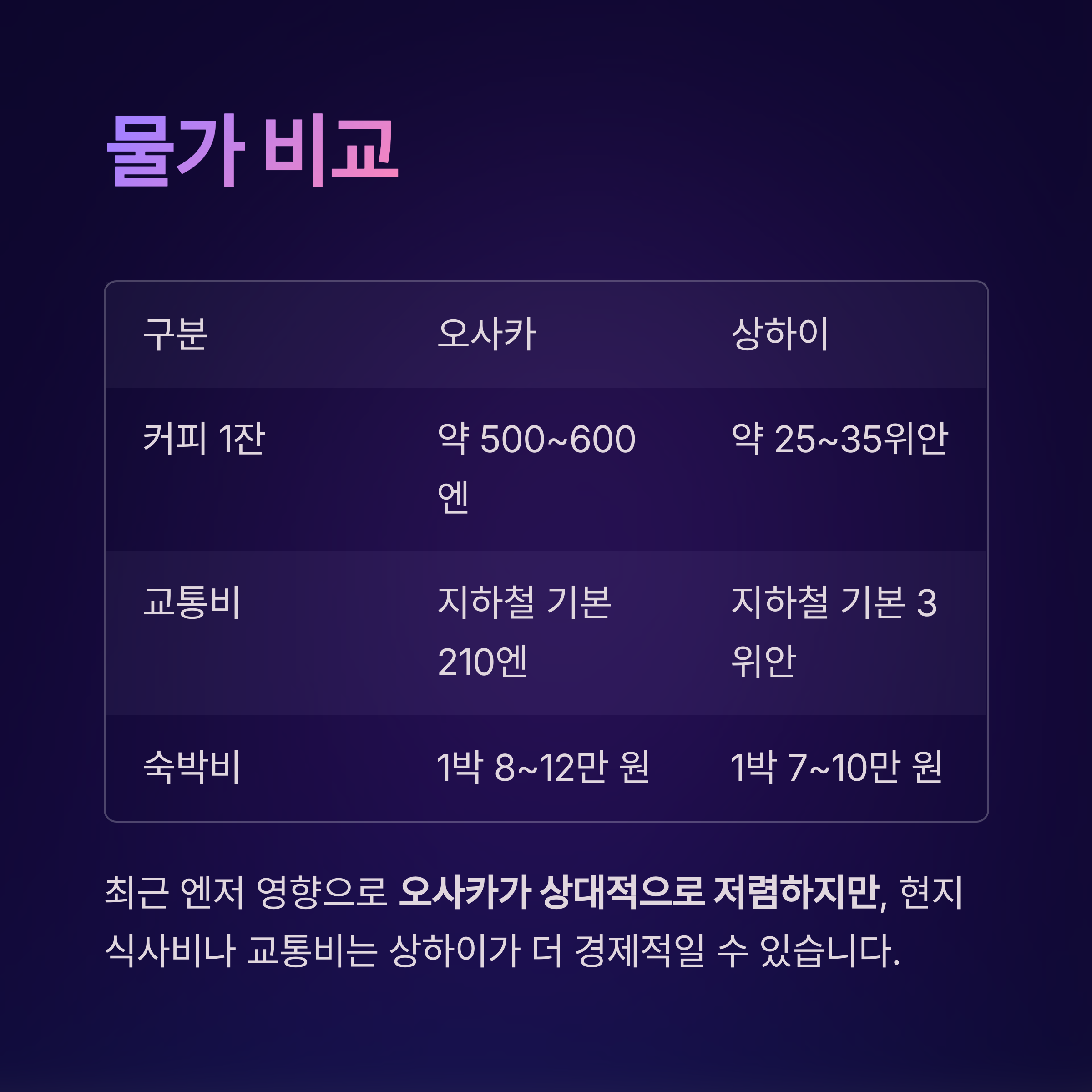 현지 식사비나 교통비 등은 상하이가 더 경제적일 수 있습니다.