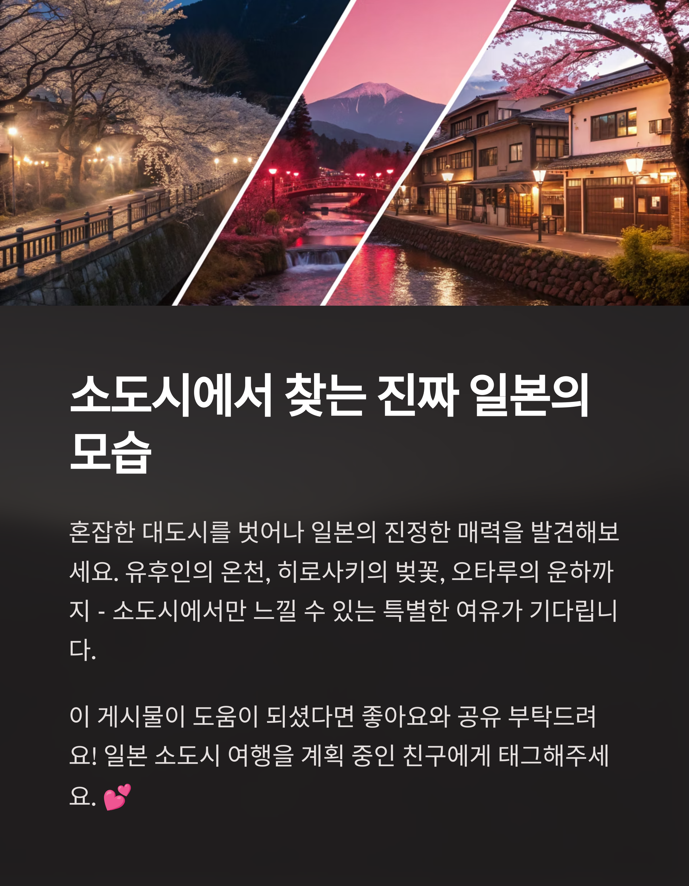 A: 유후인, 다카야마, 마츠에는 일본 고유의 정취를 간직한 소도시입니다. - Q: 사진 찍기 좋은 인스타 감성 장소는?
