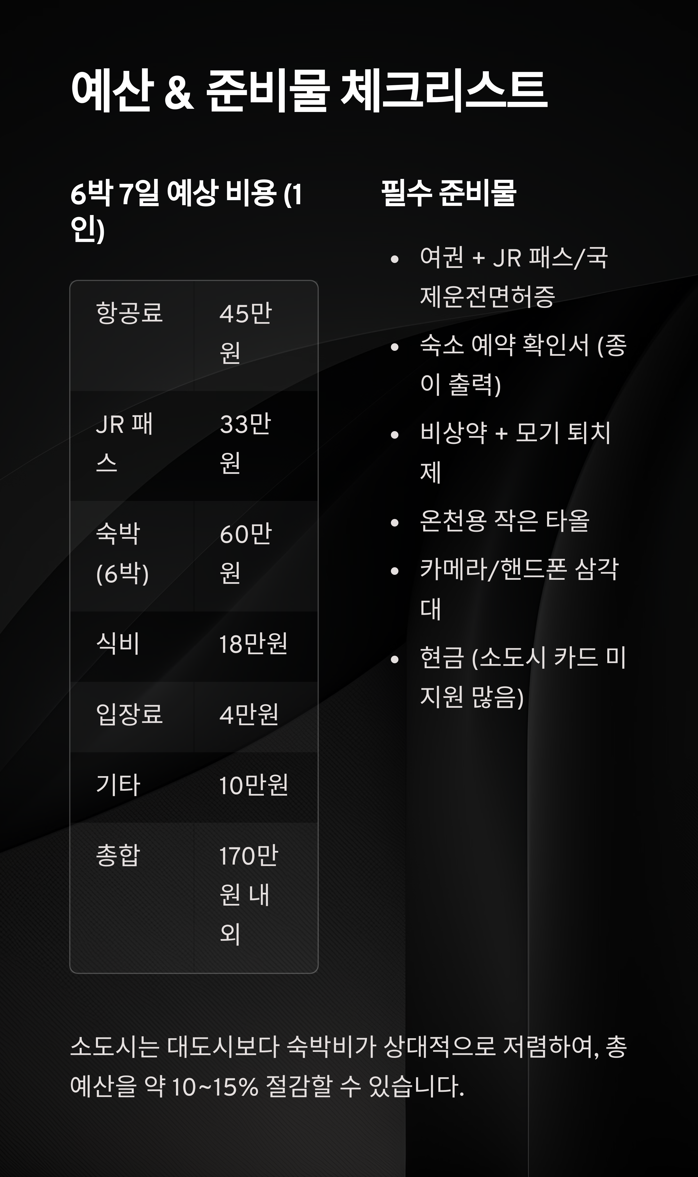 이 코스는 도시 간 이동 시 JR Pass 또는 렌터카를 활용하면 시간과 비용을 아낄 수 있습니다.