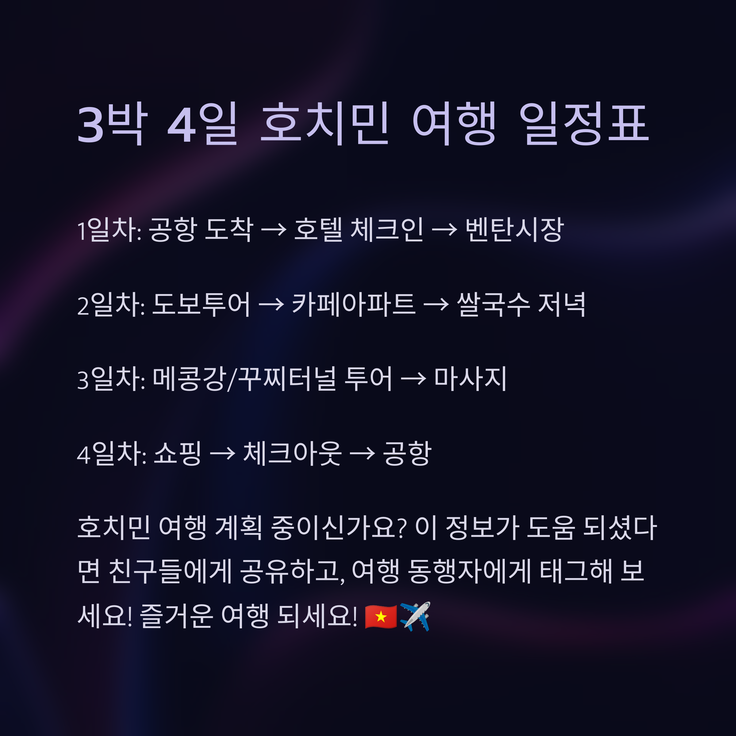 | 1일차 | 공항 도착 → 호텔 체크인 → 벤탄시장 둘러보기 |