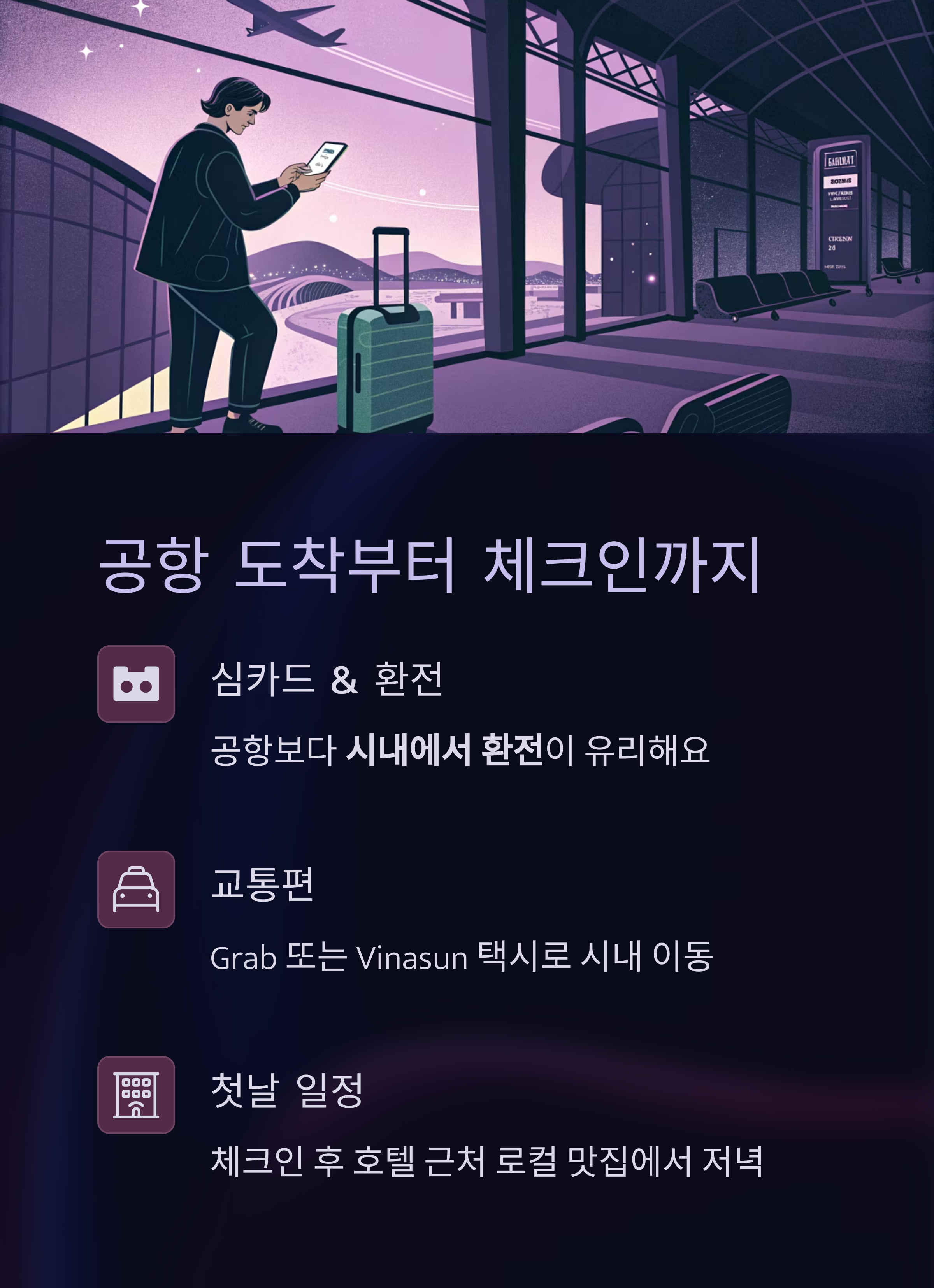 - 공항에서 시내까지는 Grab 또는 Vinasun 택시 이용