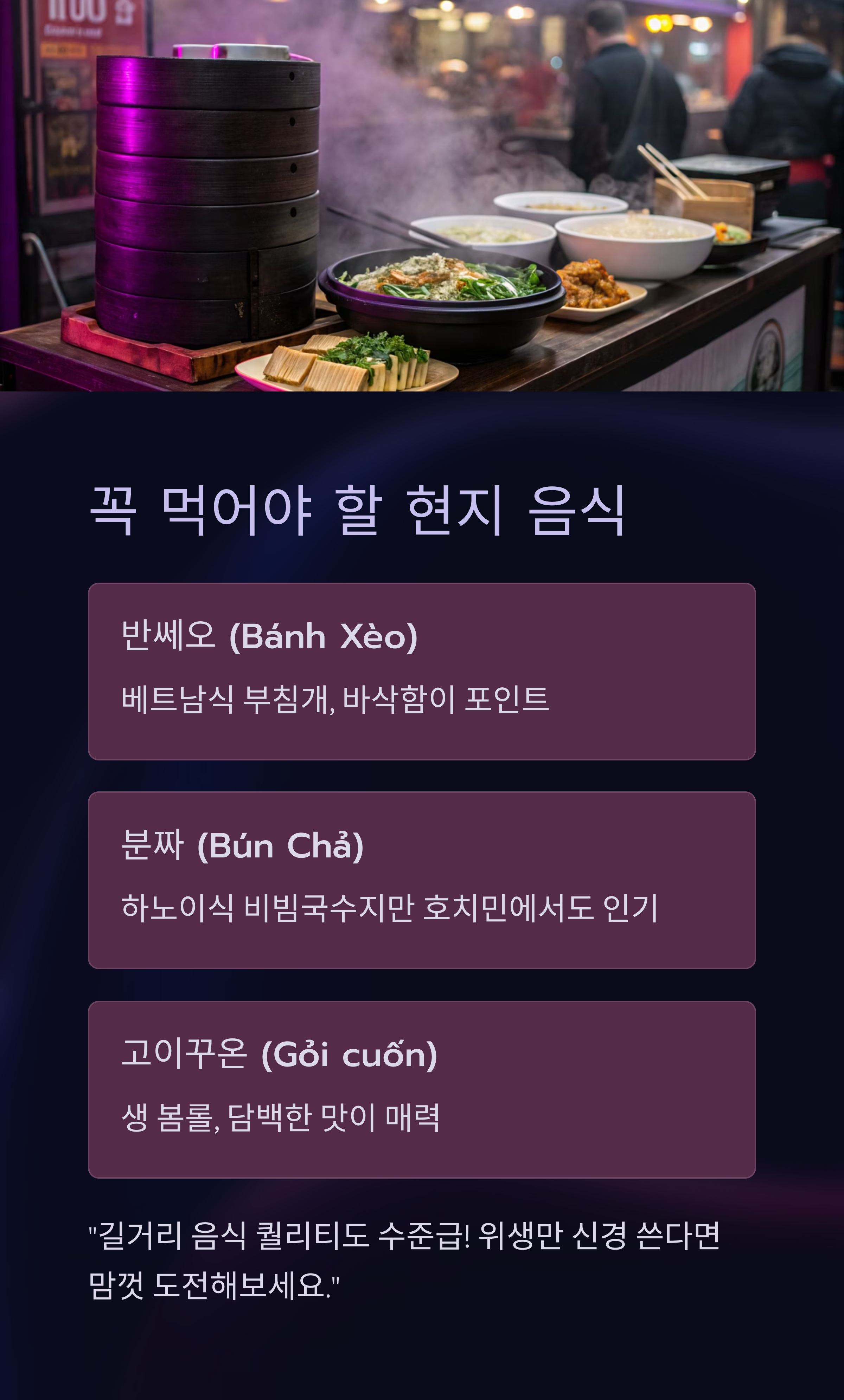 "호치민은 길거리 음식 퀄리티도 수준급! 위생만 신경 쓴다면 맘껏 도전해보세요."