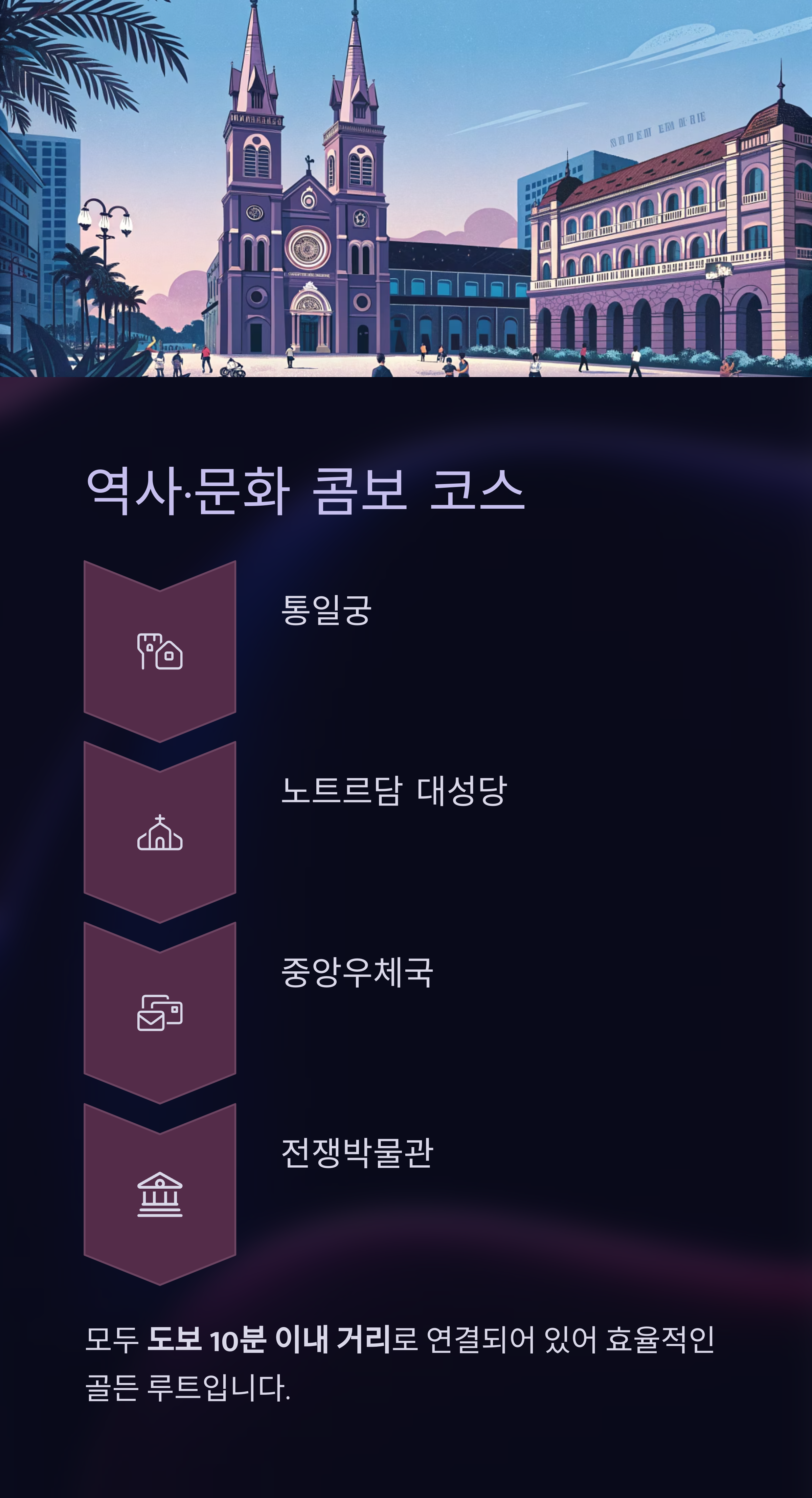 - 통일궁 → 노트르담 대성당 → 중앙우체국 → 전쟁박물관 → 벤탄시장