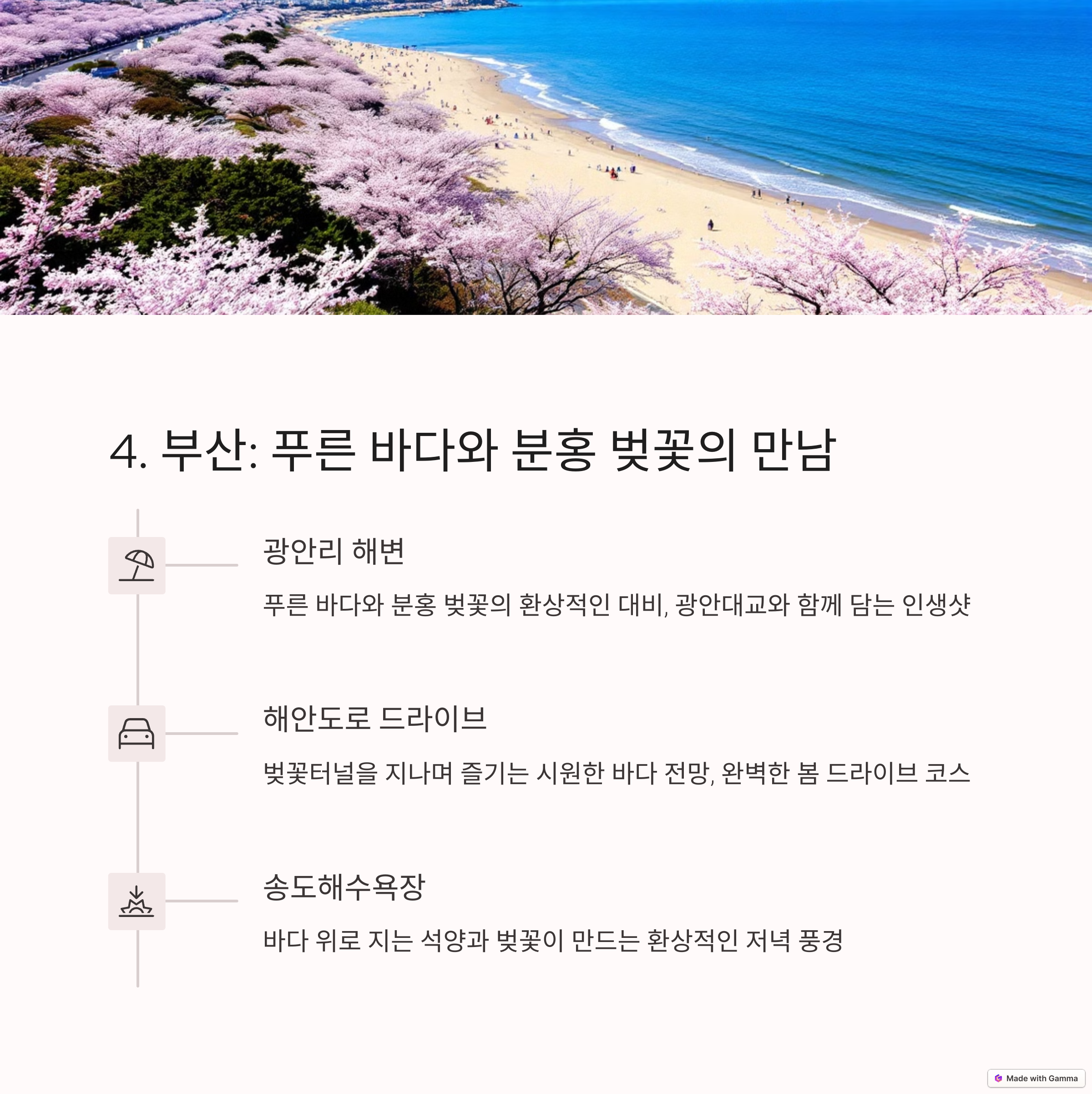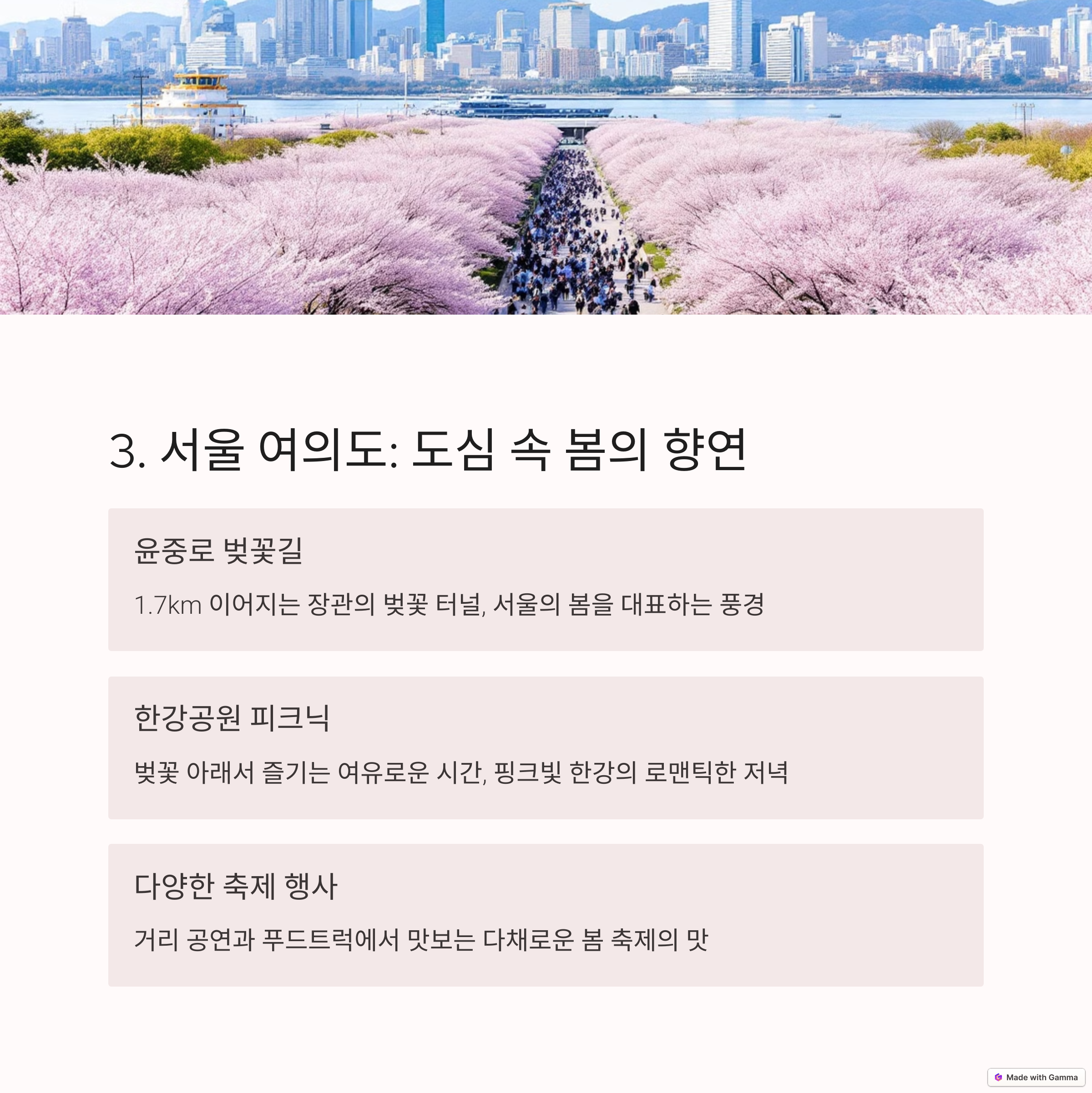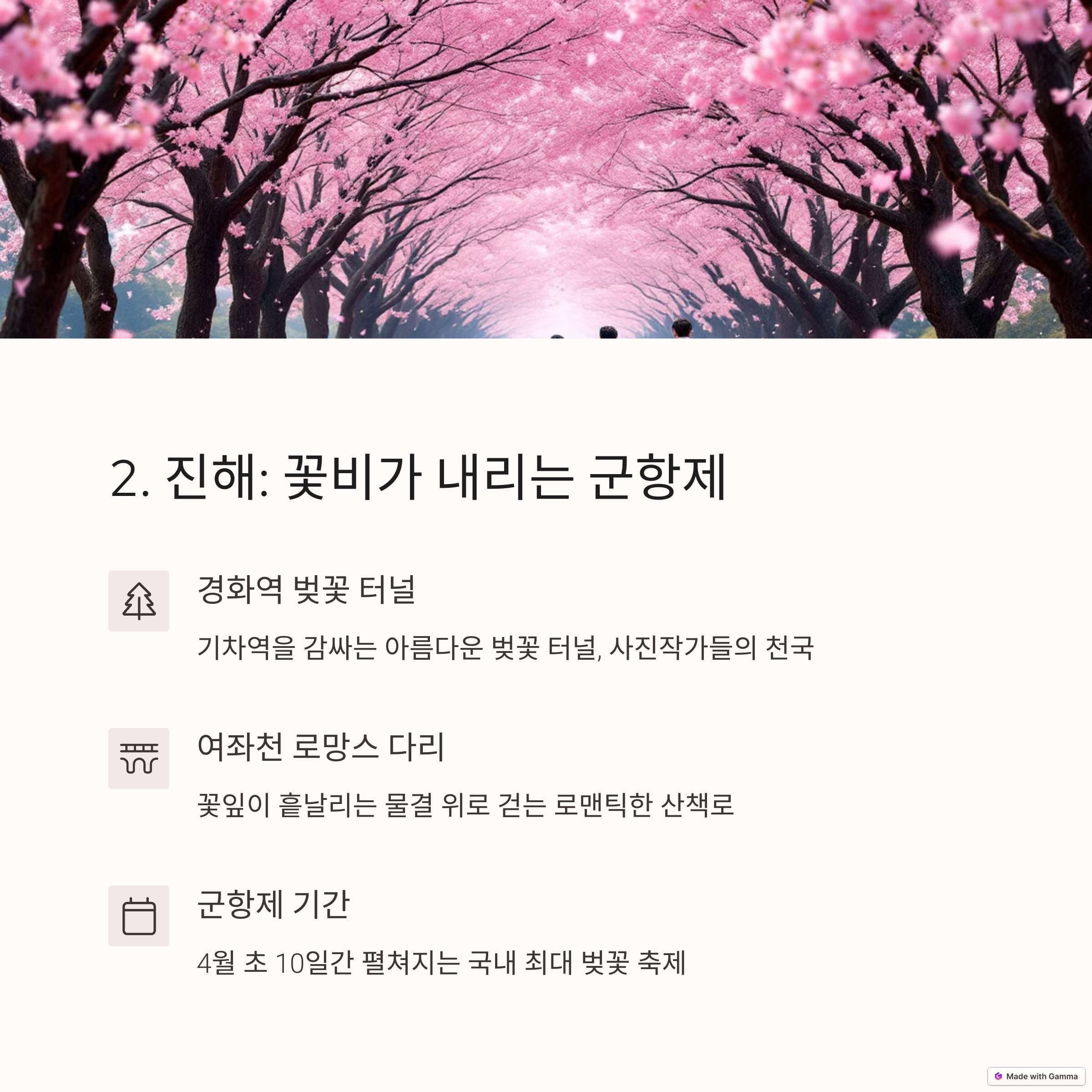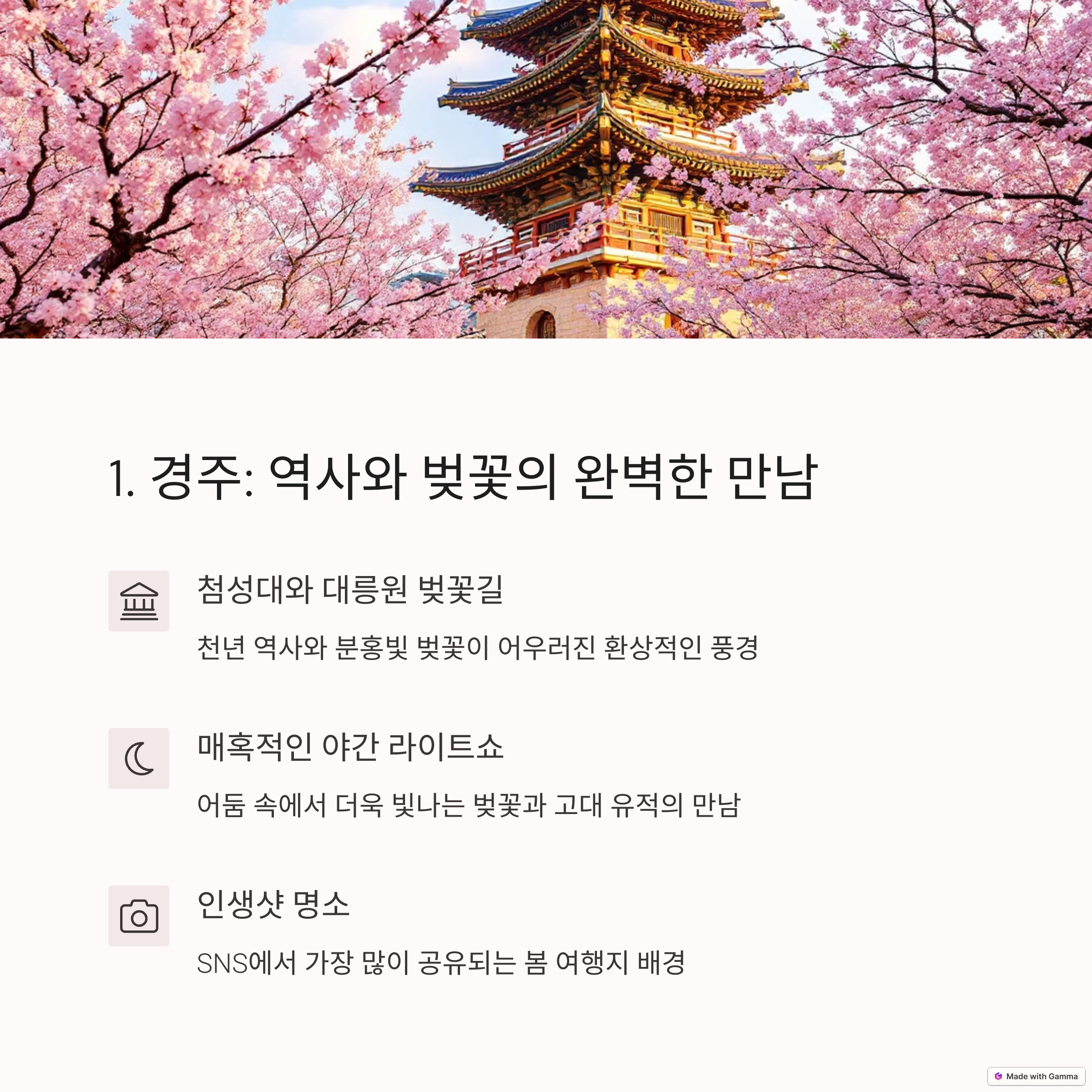 | 벚꽃 여행지 | 진해, 경주, 여의도 등 전국이 벚꽃 명소로 가득해요 |