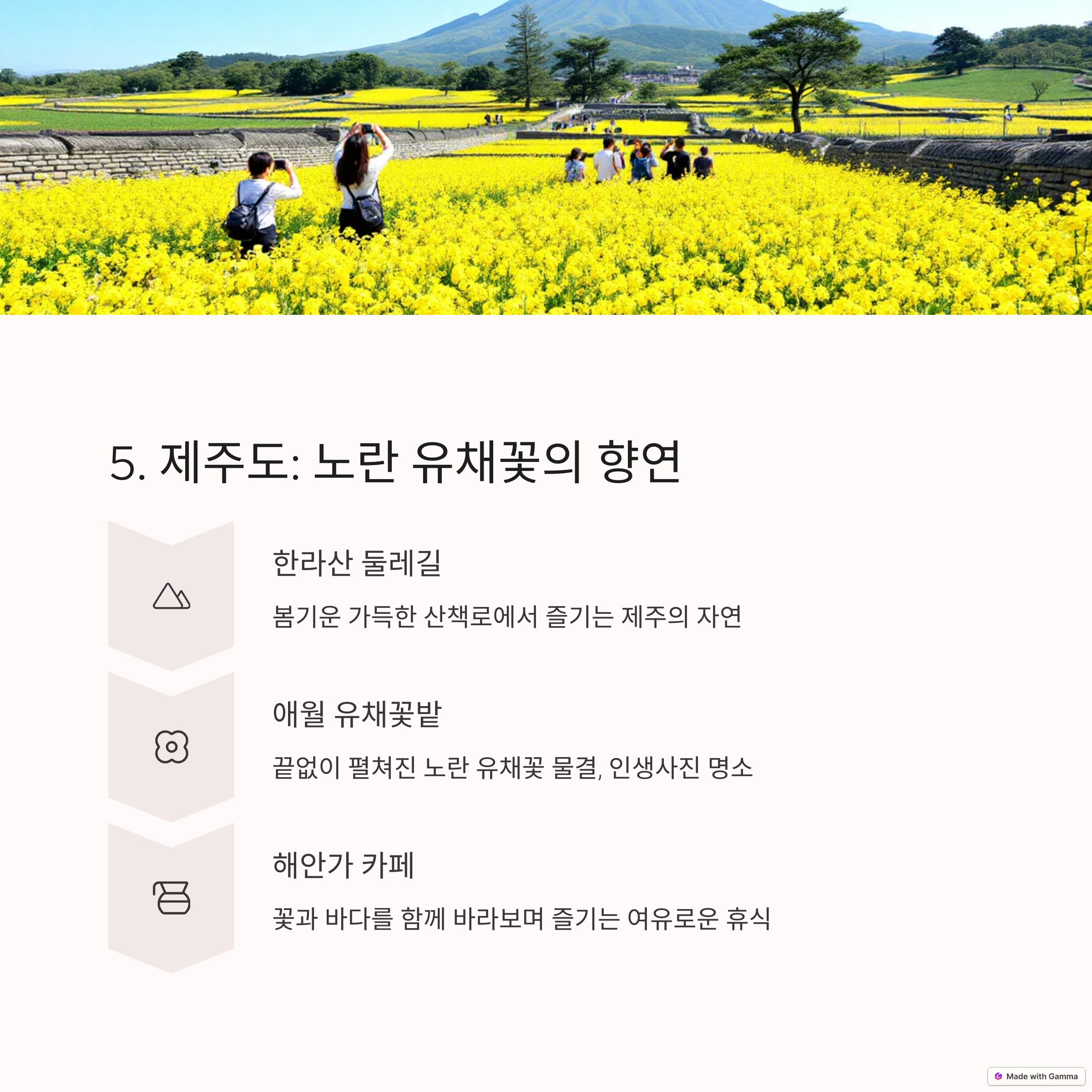 서울 여의도와 부산, 제주도는 도심 속 또는 자연 속에서 벚꽃과 봄의 정취를 동시에 느낄 수 있는 장소입니다. 여의도는 윤중로 벚꽃길을 따라 다양한 문화 공연과 푸드트럭이 즐비하여 봄의 활기를 만끽할 수 있으며, 부산은 광안리, 송도 등 해변과 벚꽃이 어우러져 인생 사진을 남기기 좋은 장소입니다. 제주도는 유채꽃과 벚꽃이 어우러져 이국적인 풍경을 자아내며, 한라산 둘레길이나 애월 유채꽃밭에서 완연한 봄을 느낄 수 있습니다.