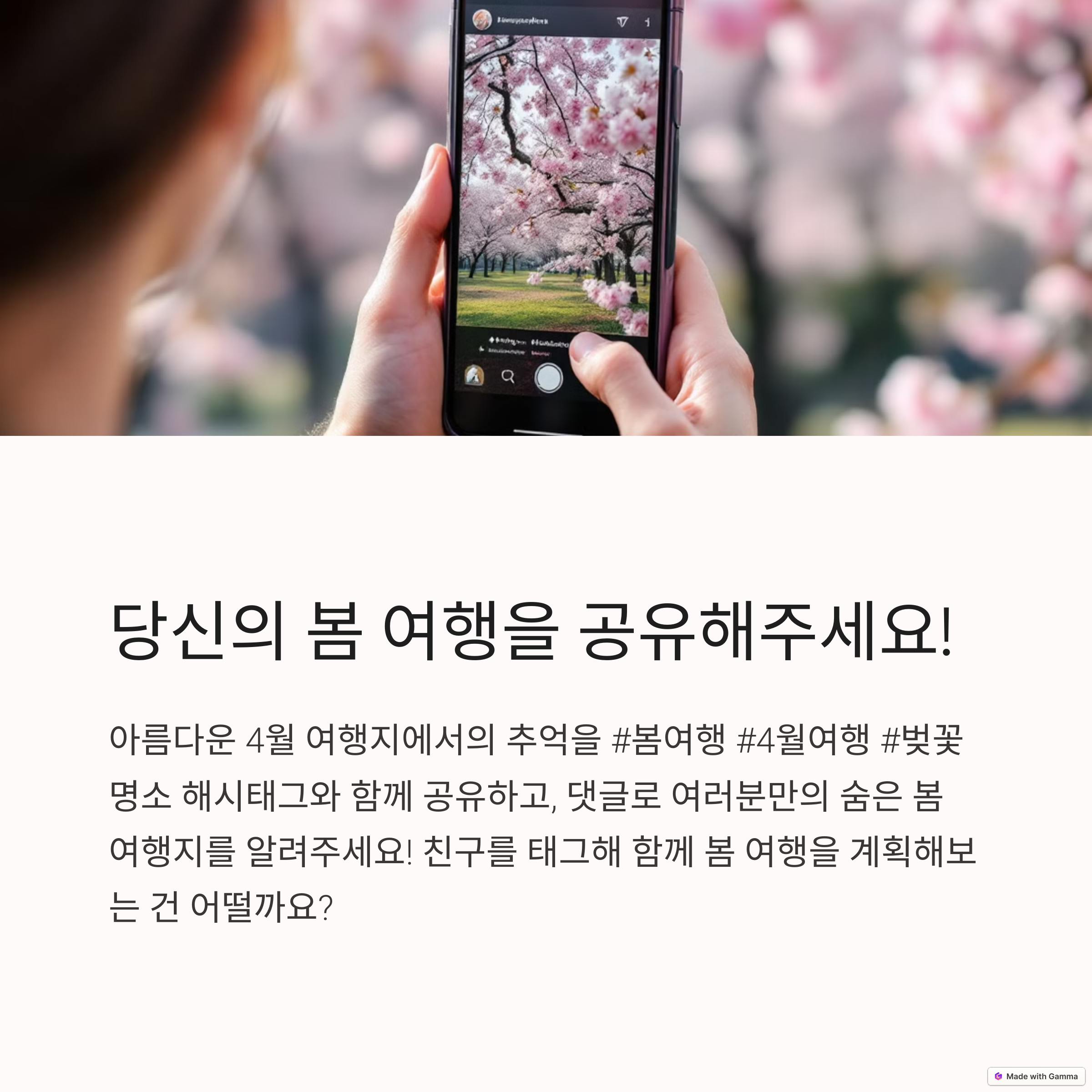 여러분이 가장 기억에 남는 봄 여행지는 어디인가요? 또는 이 포스팅에서 소개한 장소 중 가보고 싶은 곳은? 댓글로 자유롭게 공유해 주세요!