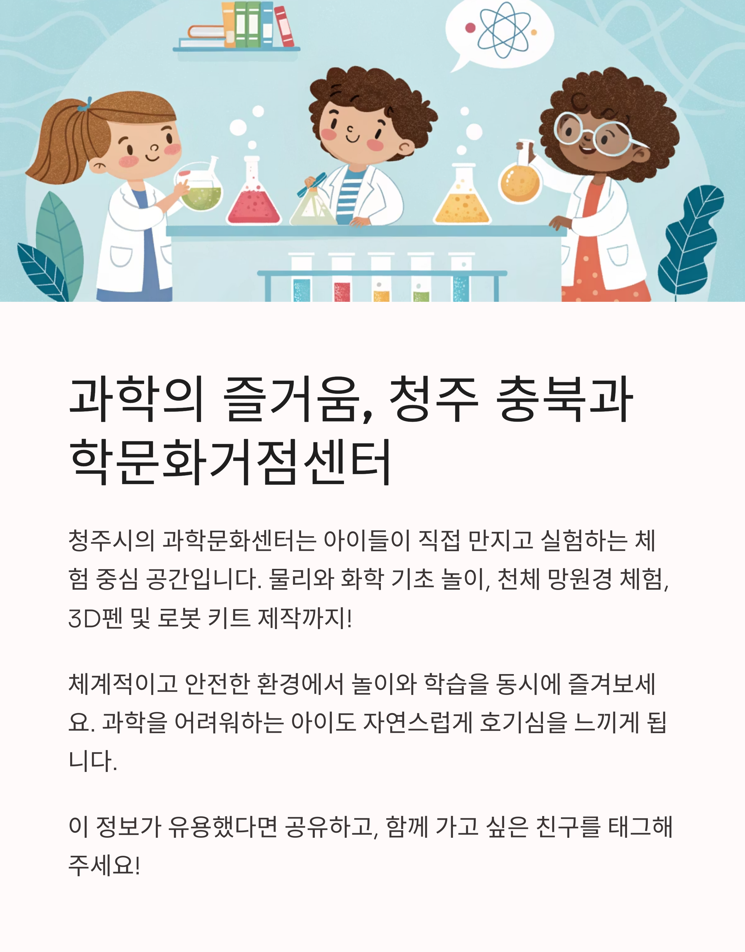 청주시에 위치한 이 과학문화센터는 아이들이 직접 만지고 실험하는 체험 중심