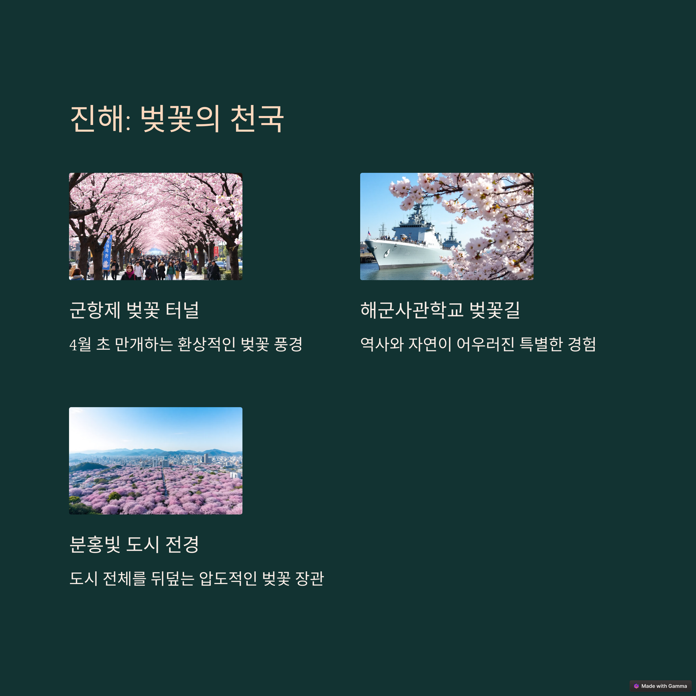강릉은 푸른 바다와 커피향이 어우러진 낭만 도시입니다. 안목해변 커피거리에서 여유롭게 커피를 마시며 바다를 감상하고, 초당순두부 맛집이나 경포대 등을 들러 자연 속에서의 여유를 만끽할 수 있습니다. 여수는 야경이 아름다운 항구 도시로 오동도, 돌산대교, 여수 밤바다 등 낭만이 가득한 장소들이 많아 커플 여행지로도 인기입니다. 진해는 벚꽃이 만개하는 4월 군항제로 유명한 도시로, 봄꽃의 절정을 만끽할 수 있습니다.