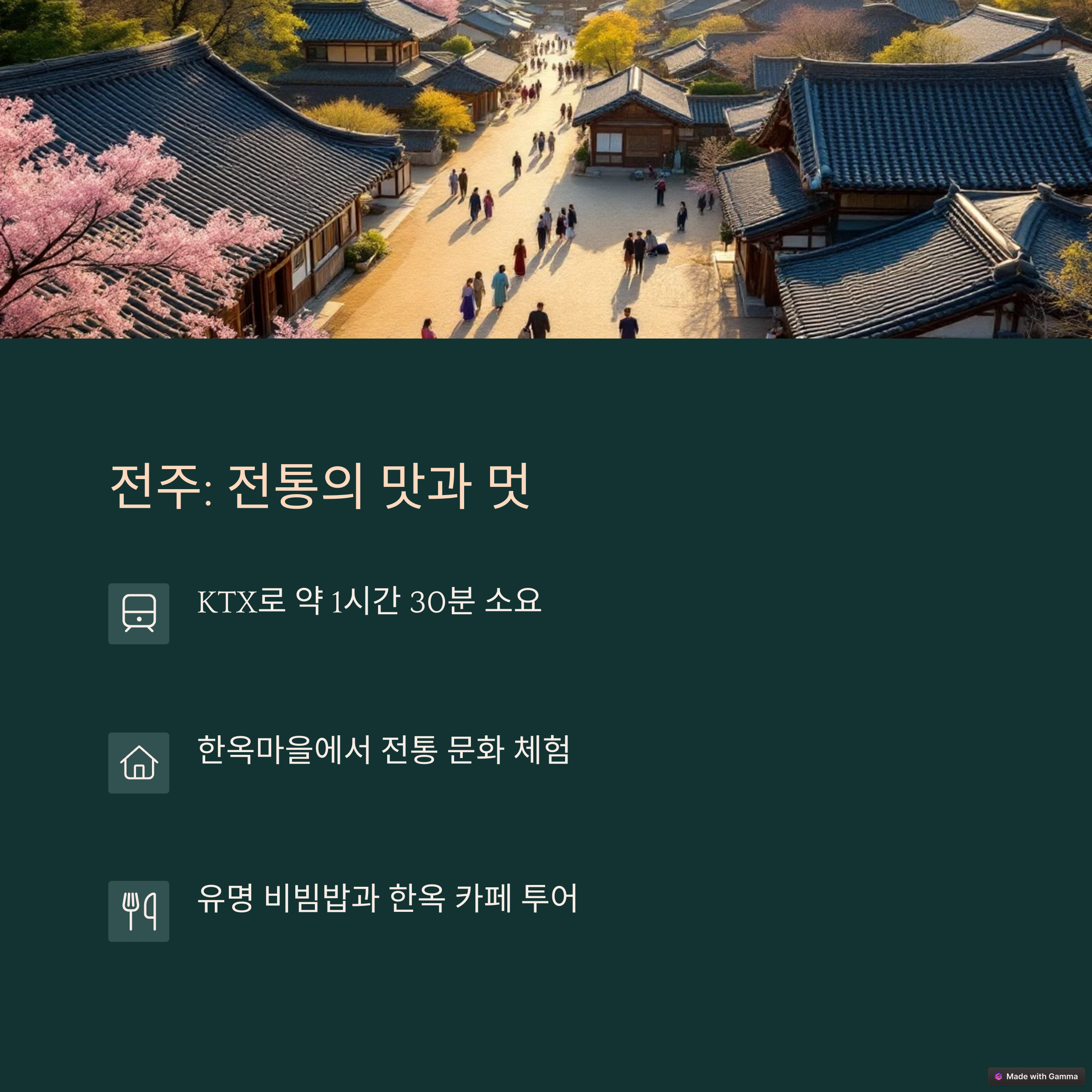 | 전주 | 한옥마을과 전주비빔밥으로 유명한 전통 도시 |