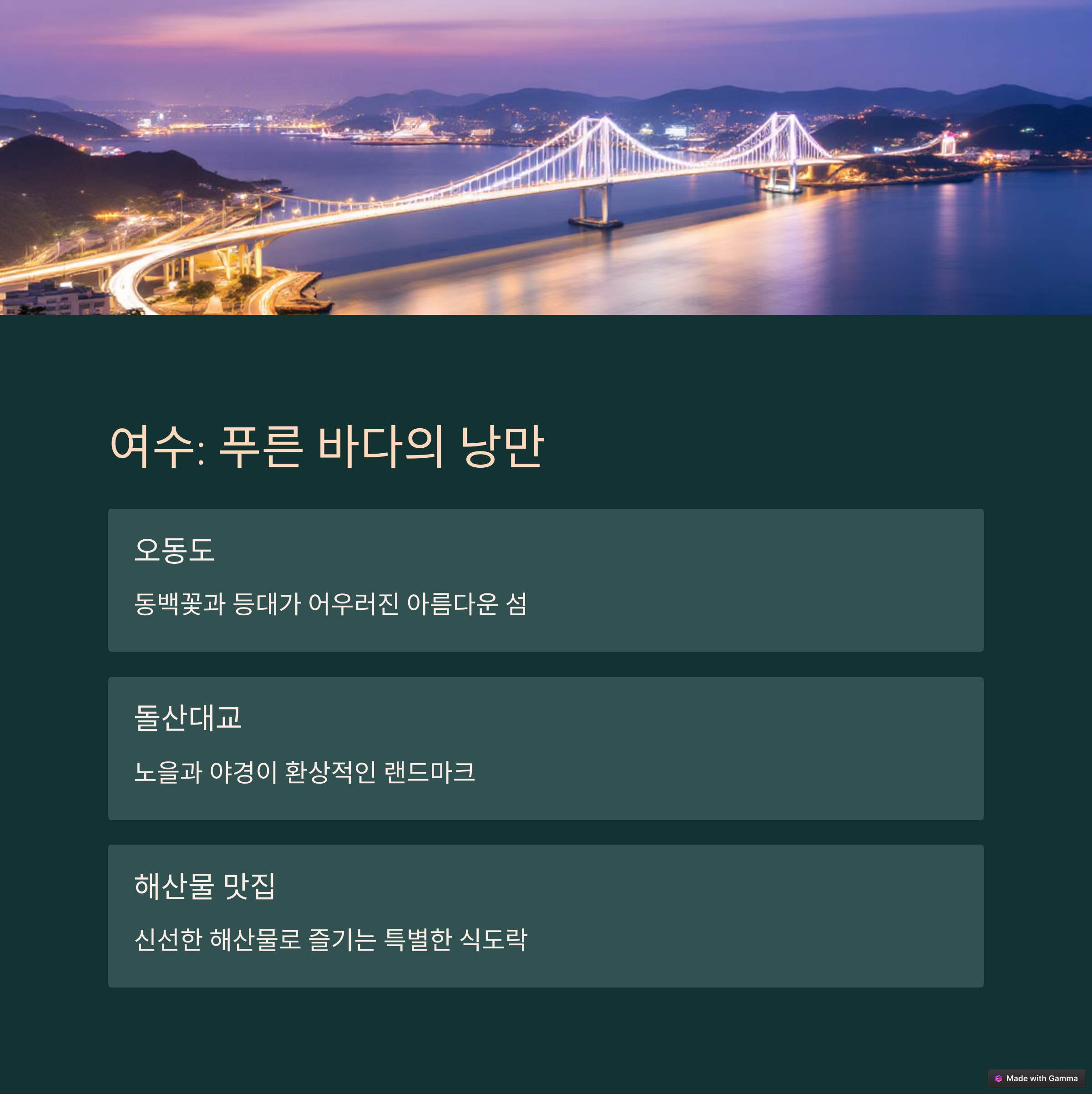 강릉은 푸른 바다와 커피향이 어우러진 낭만 도시입니다. 안목해변 커피거리에서 여유롭게 커피를 마시며 바다를 감상하고, 초당순두부 맛집이나 경포대 등을 들러 자연 속에서의 여유를 만끽할 수 있습니다. 여수는 야경이 아름다운 항구 도시로 오동도, 돌산대교, 여수 밤바다 등 낭만이 가득한 장소들이 많아 커플 여행지로도 인기입니다. 진해는 벚꽃이 만개하는 4월 군항제로 유명한 도시로, 봄꽃의 절정을 만끽할 수 있습니다.