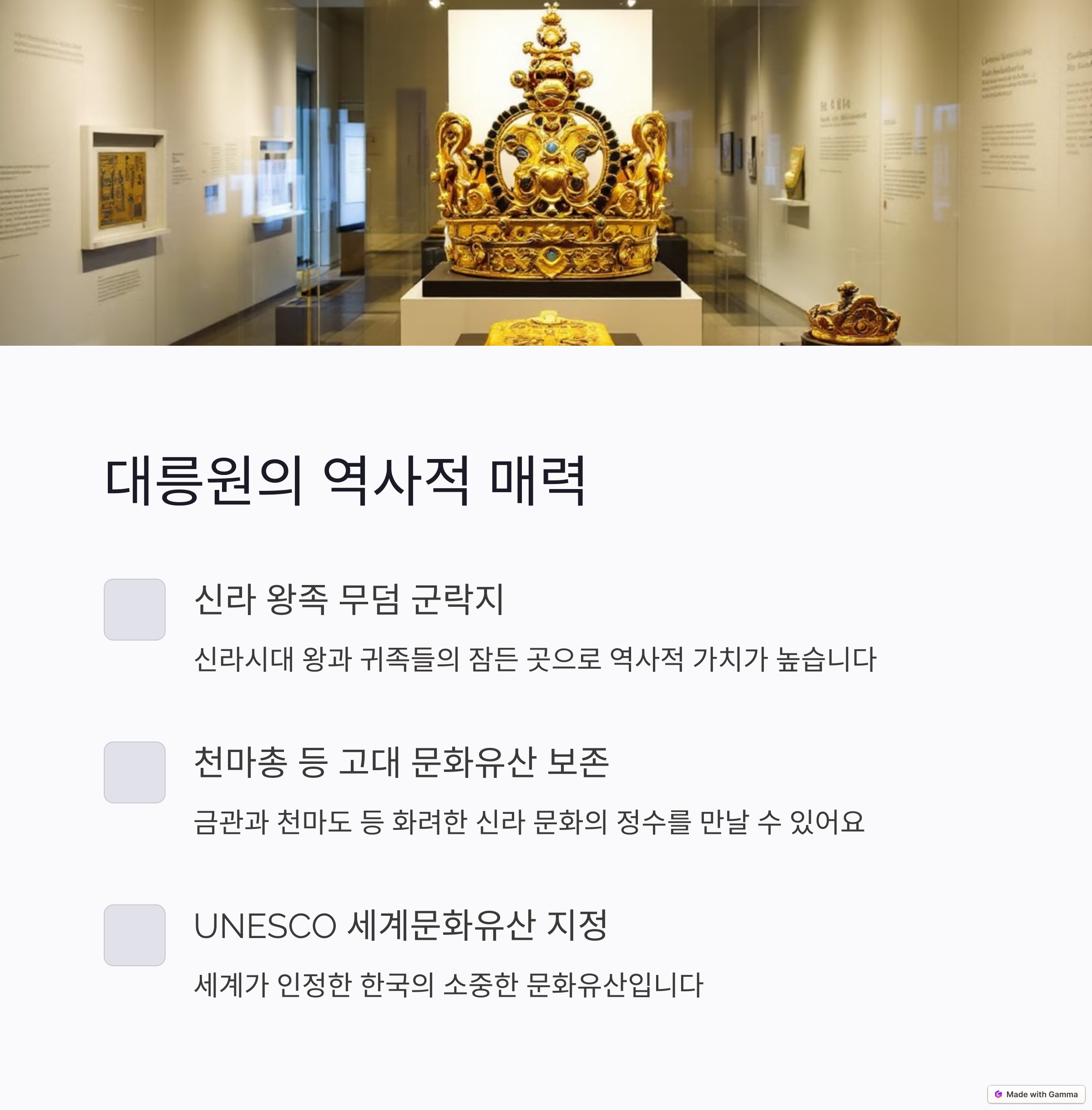 | 경주 대릉원이란? | 신라 왕족의 무덤이 모인 역사 유적지입니다. |