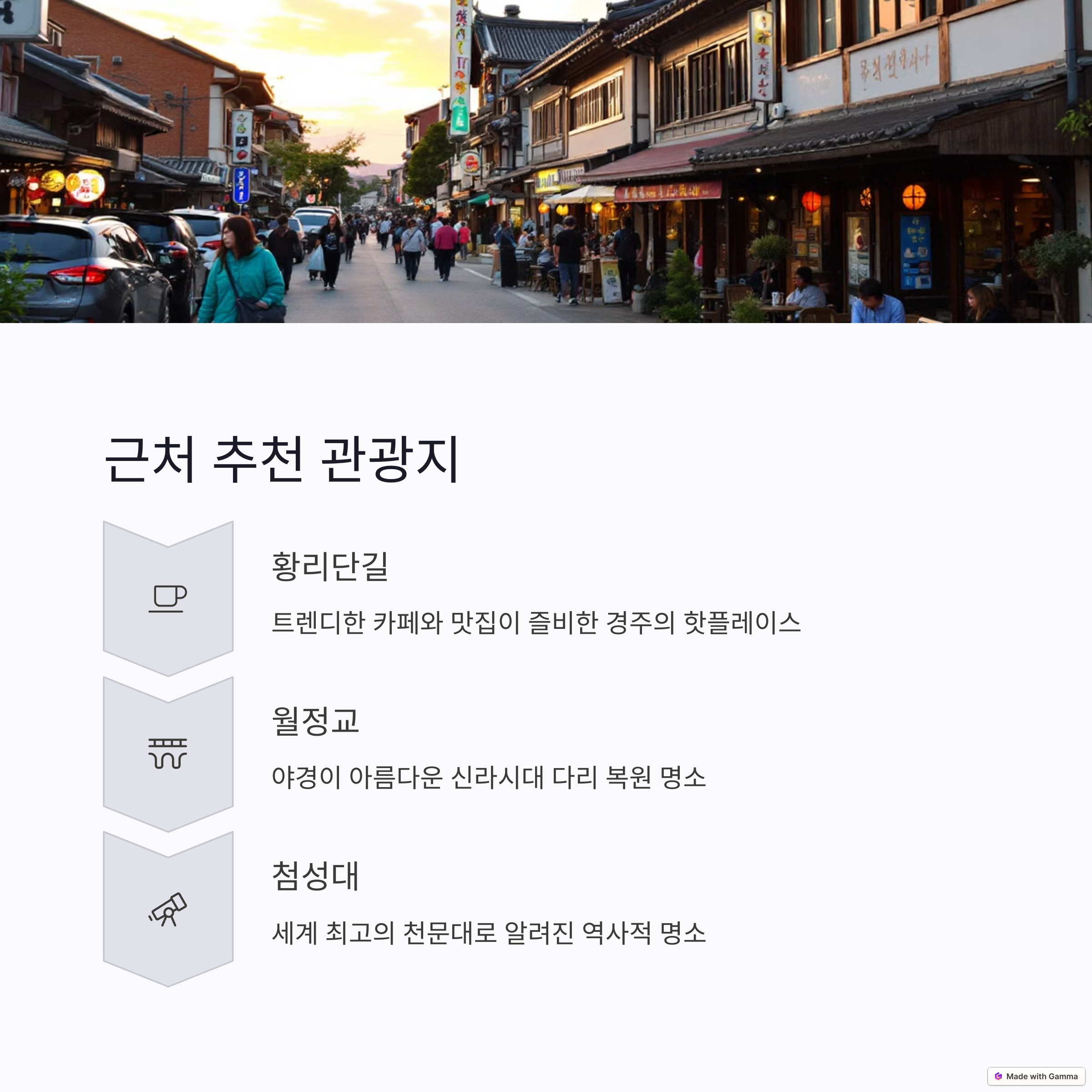 인생샷을 노리는 여행자라면 이른 아침을 노려보세요. 특히 대릉원 입구 인근에 위치한 유명한 꽃길 포인트는 해가 막 떠오를 무렵, 자연광이 가장 아름답게 비추는 시간대에 황홀한 장면을 선사합니다. 또한 대릉원과 인접한 황리단길에서 커피 한 잔의 여유를 즐기거나 월정교에서 야경을 감상하는 것도 빼놓을 수 없는 묘미입니다. 경주라는 도시는 고요한 풍경 속에서 깊은 감동을 주는 여행지로, 그 중심에 바로 이 대릉원이 있습니다.