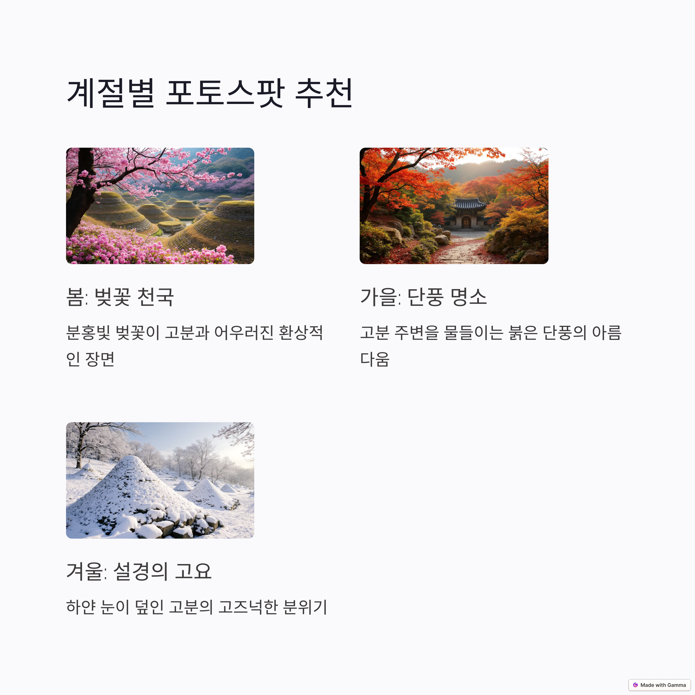 | 천마총 내부 전시 관람 가능, 역사 교육 효과도 큼 | 벚꽃과 고분이 어우러진 독특한 풍경 연출 | 가족, 연인, 친구 모두에게 적합한 힐링 명소 |
