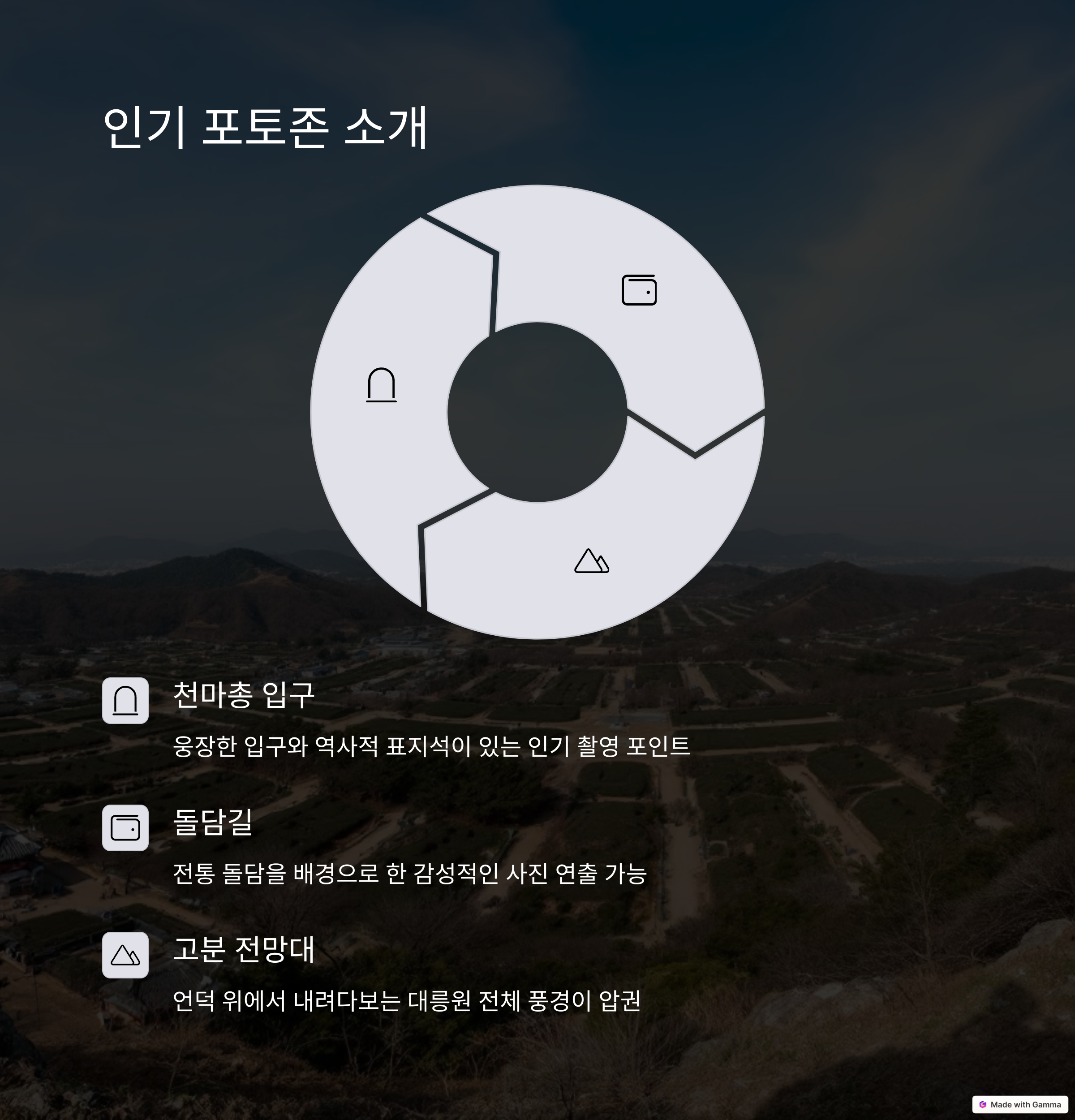 | 신라 시대 무덤 유적지로 역사적 가치가 높습니다. | 봄철 벚꽃이 만개해 사진 찍기 좋은 장소입니다. | 황리단길, 월정교와 함께 묶어 즐기기 좋습니다. |