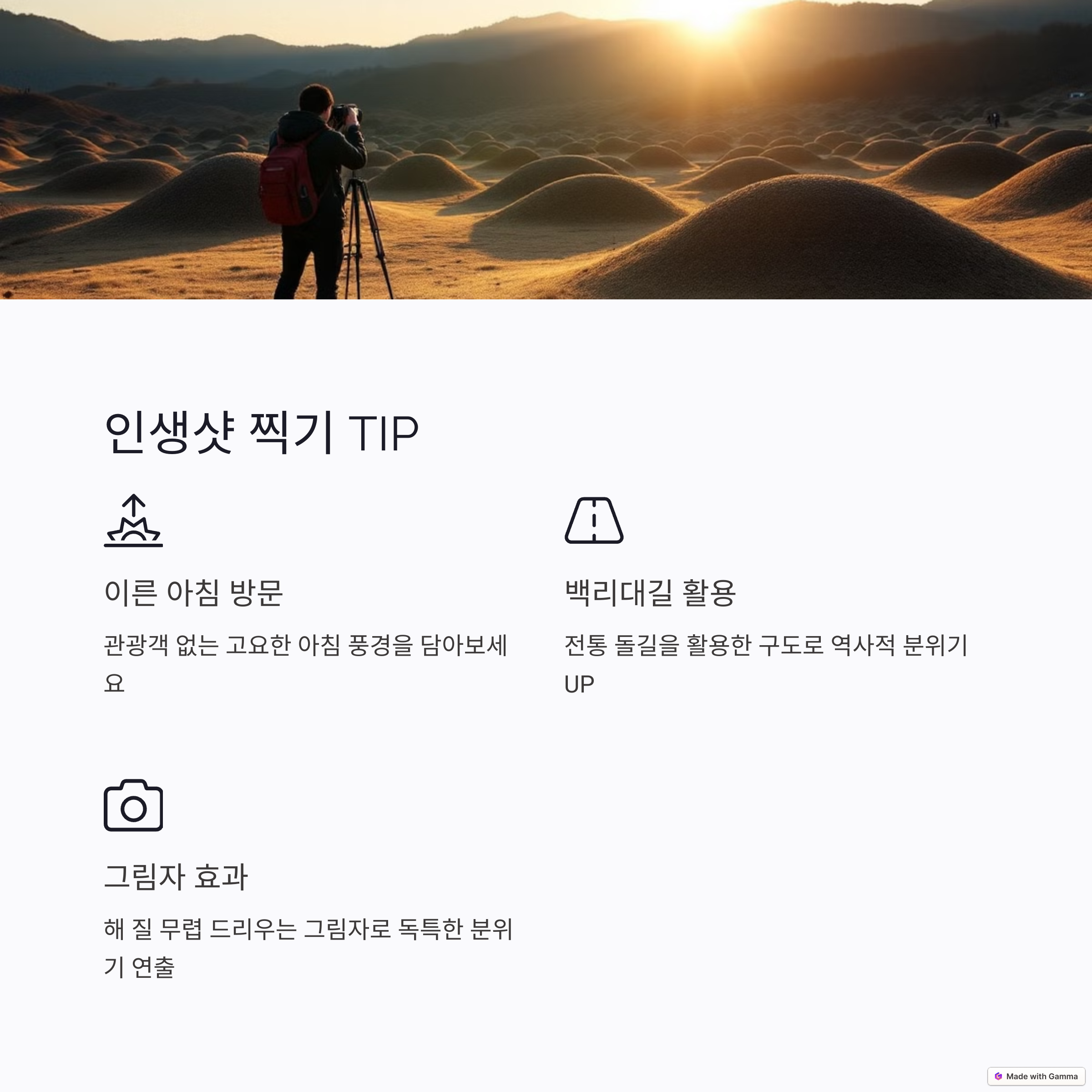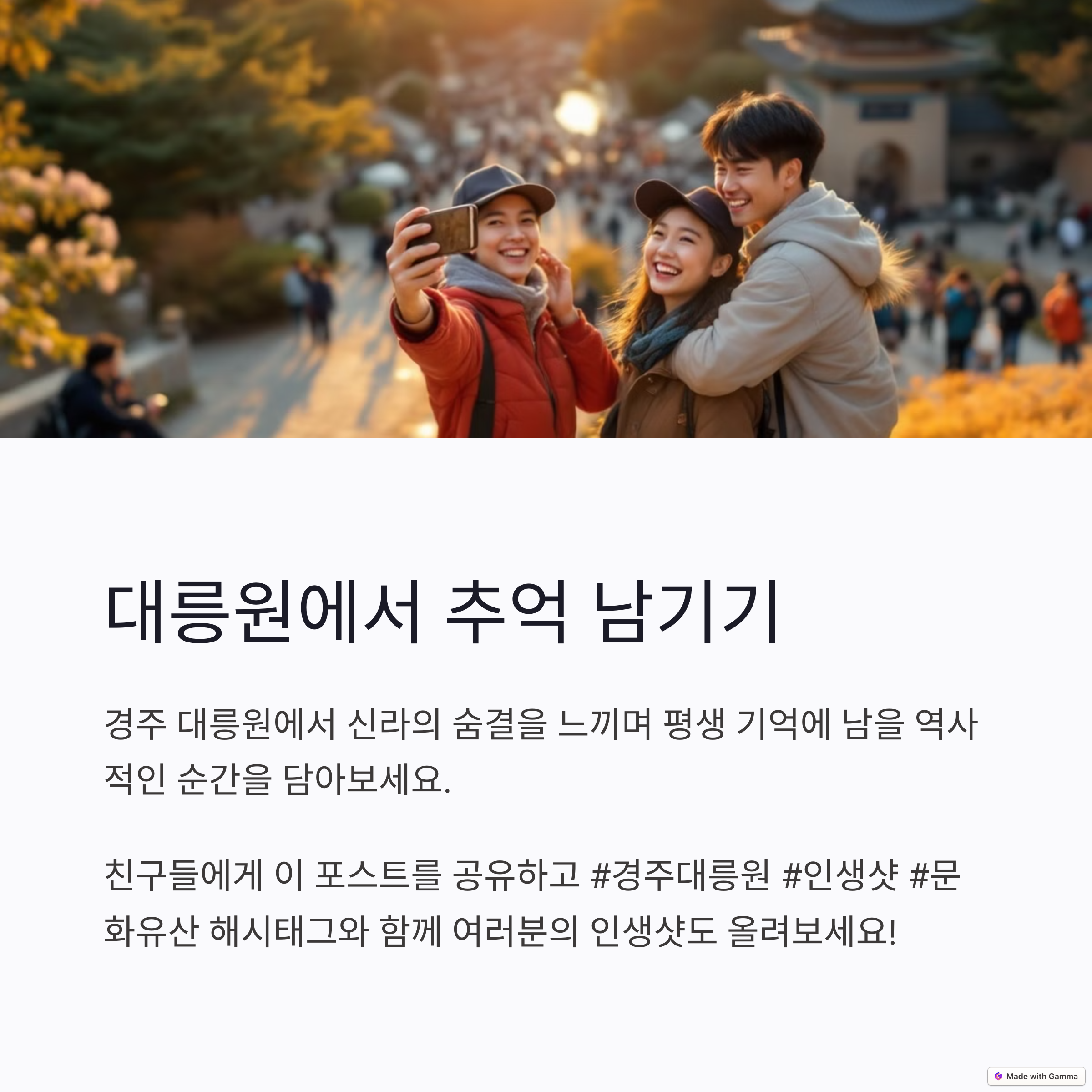 경주 대릉원에서의 특별한 순간, 여러분은 어떤 사진을 남기셨나요? 혹시 추천하고 싶은 스팟이나 촬영 팁이 있다면 댓글로 공유해주세요! 다른 여행자들에게 큰 도움이 될 수 있습니다.